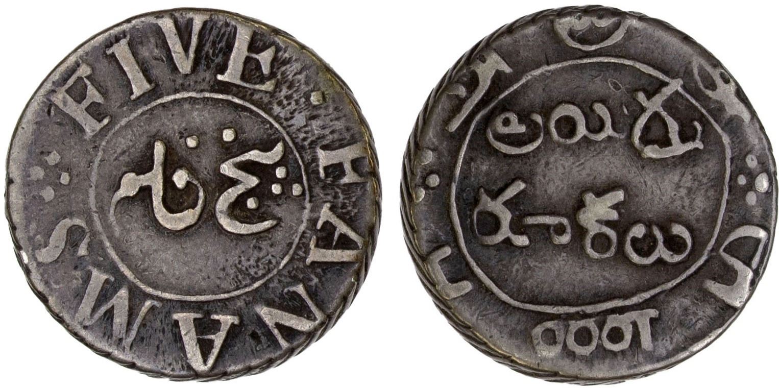 MADRAS PRESIDENCY: AR 5 fanams (4.64g), ND (1807), KM-342, first series, without garter, denomination in 4 languages (Persian and English on obverse, Telugu and Tamil on reverse), some old cleaning, nicely retoned, accompanied by collector's information card, VF, RR, ex Anton Holt Collection.
