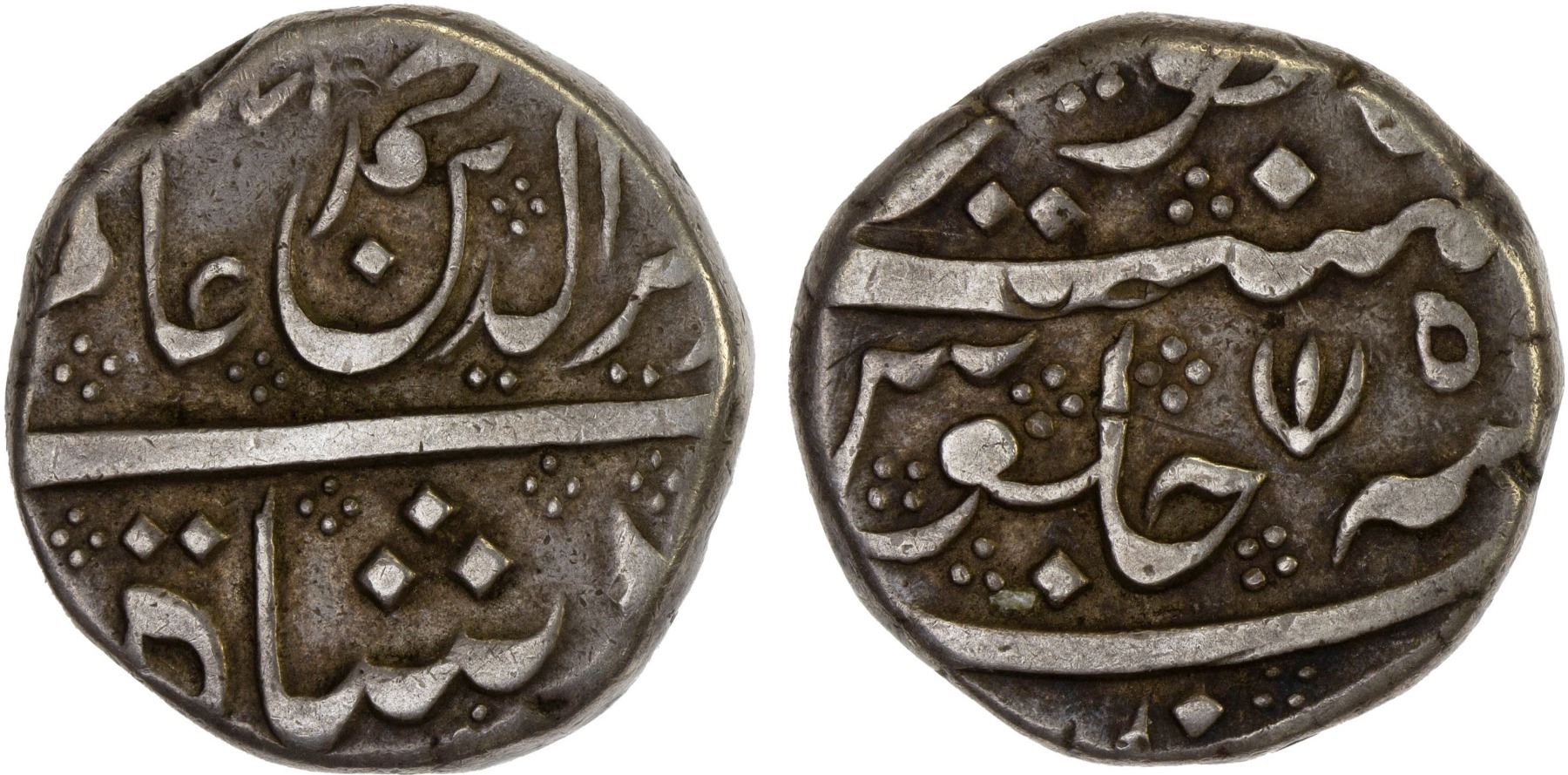 MADRAS PRESIDENCY: AR rupee (11.20g), "Arkat", AH(11)71 year 5, Stv-2.62, Prid-139A, in the name of the Mughal Alamgir II (1754-1759), VF, R. The issue dated AH1172 and regnal year 6 became a frozen design and is very common.