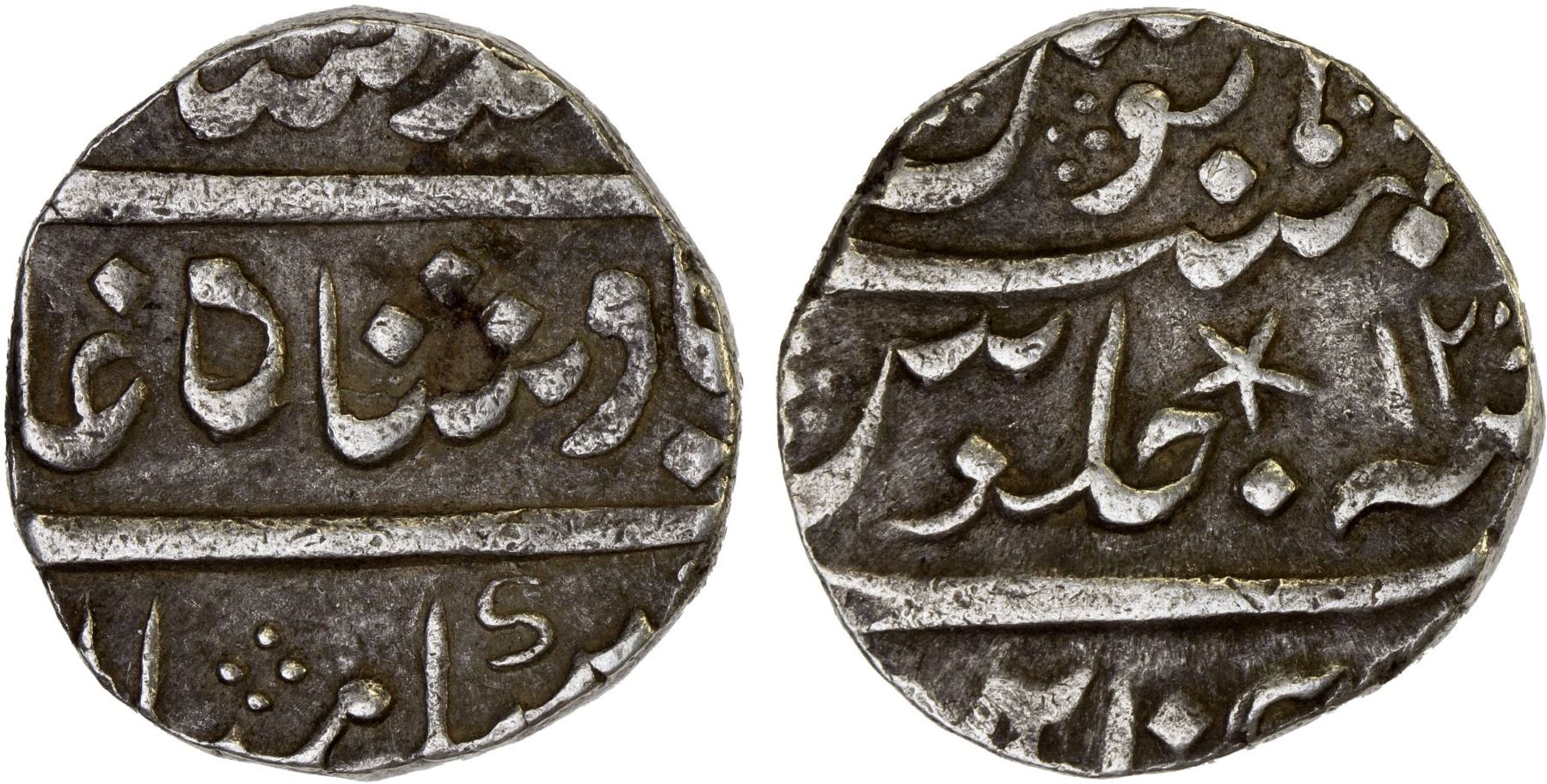 MADRAS PRESIDENCY: AR rupee (11.77g), Chinapatan, year 12, Stv-. KM-G302, cf. Stv-2.39/40 for years 11 and 13, in the name of the Mughal Muhammad Shah; appears to be unpublished date, bold VF, RR.