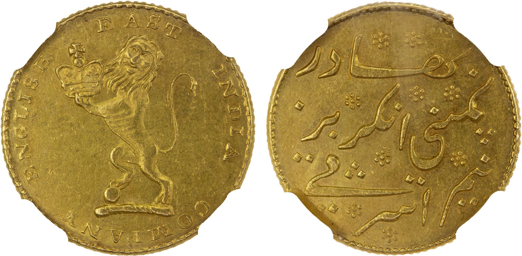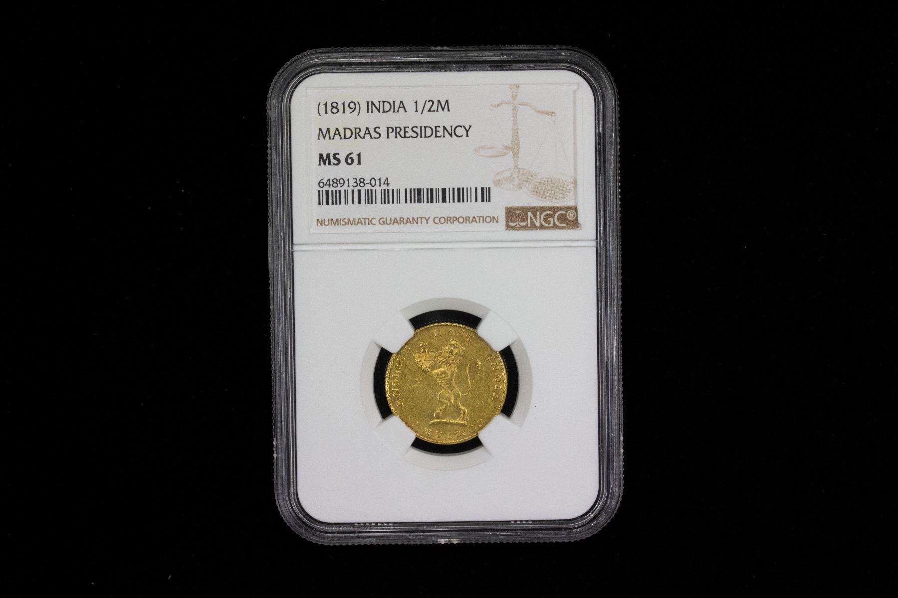 MADRAS PRESIDENCY: AV 1/2 mohur (1/2 ashrafi), ND (1819), Stv-4.5, Prid-242. KM-420, British East India Company issue, lion standing on its hind legs, holding crown // Persian legend including the denomination, nim ashrafi kampani angrez bahadur ("half ashrafi of the honorable English company"), NGC graded MS61.