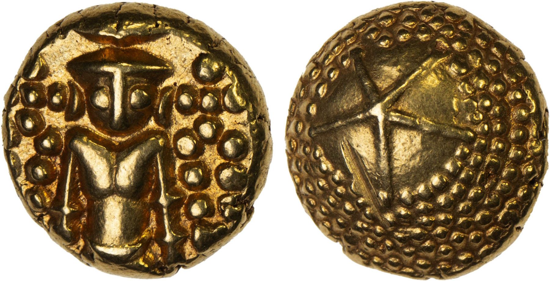 MADRAS PRESIDENCY: AV pagoda (3.33g), ND (1740-1806), Stv-1.11, half-portrait of Vishnu // star in center, granulated area around, AU, ex Ian Todd Collection.