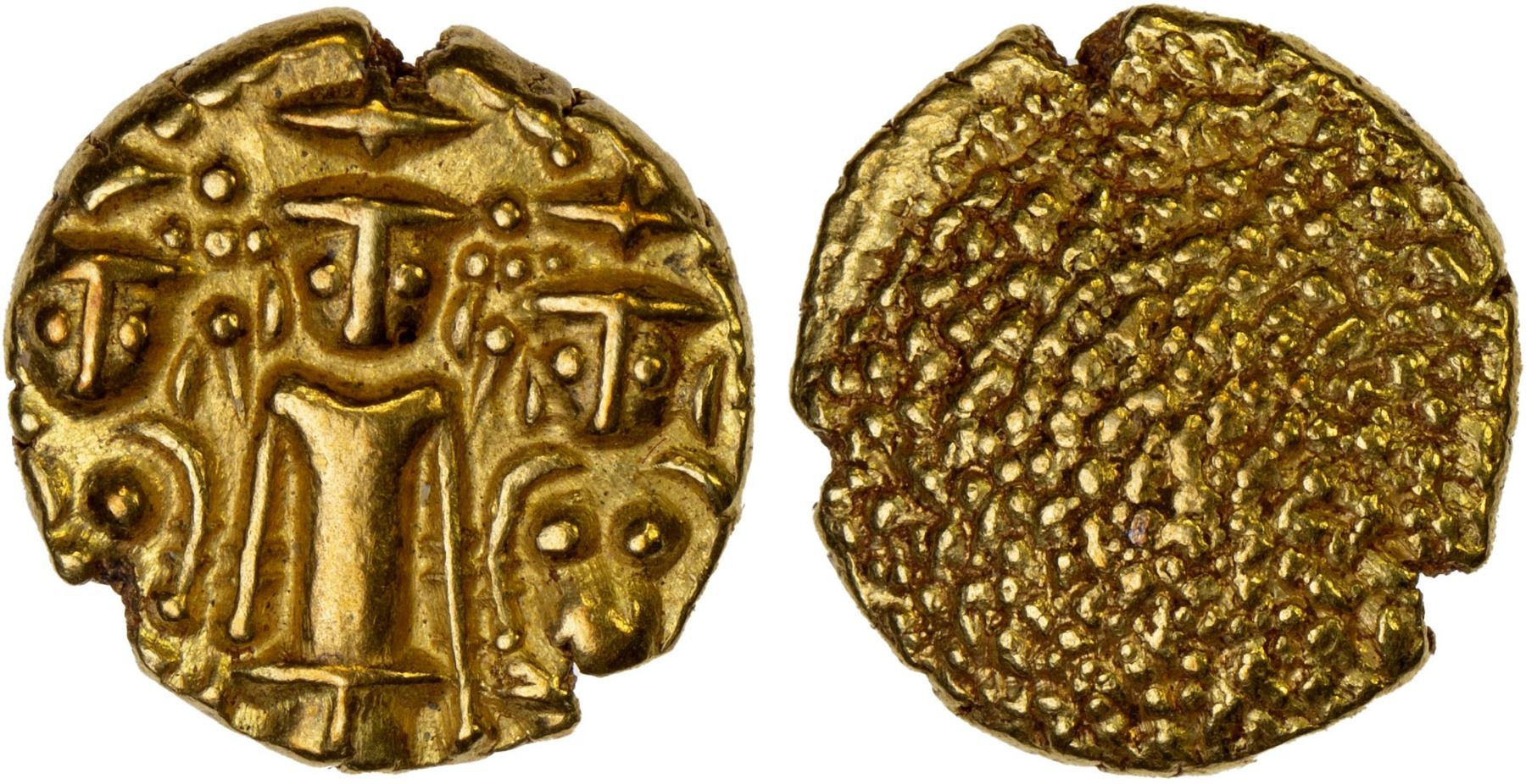 MADRAS PRESIDENCY: AV pagoda (3.4g), ND (ca. 1740-1807), Stv-1,4, Prid-3B, three half-figure deities standing // granulated reverse, XF.