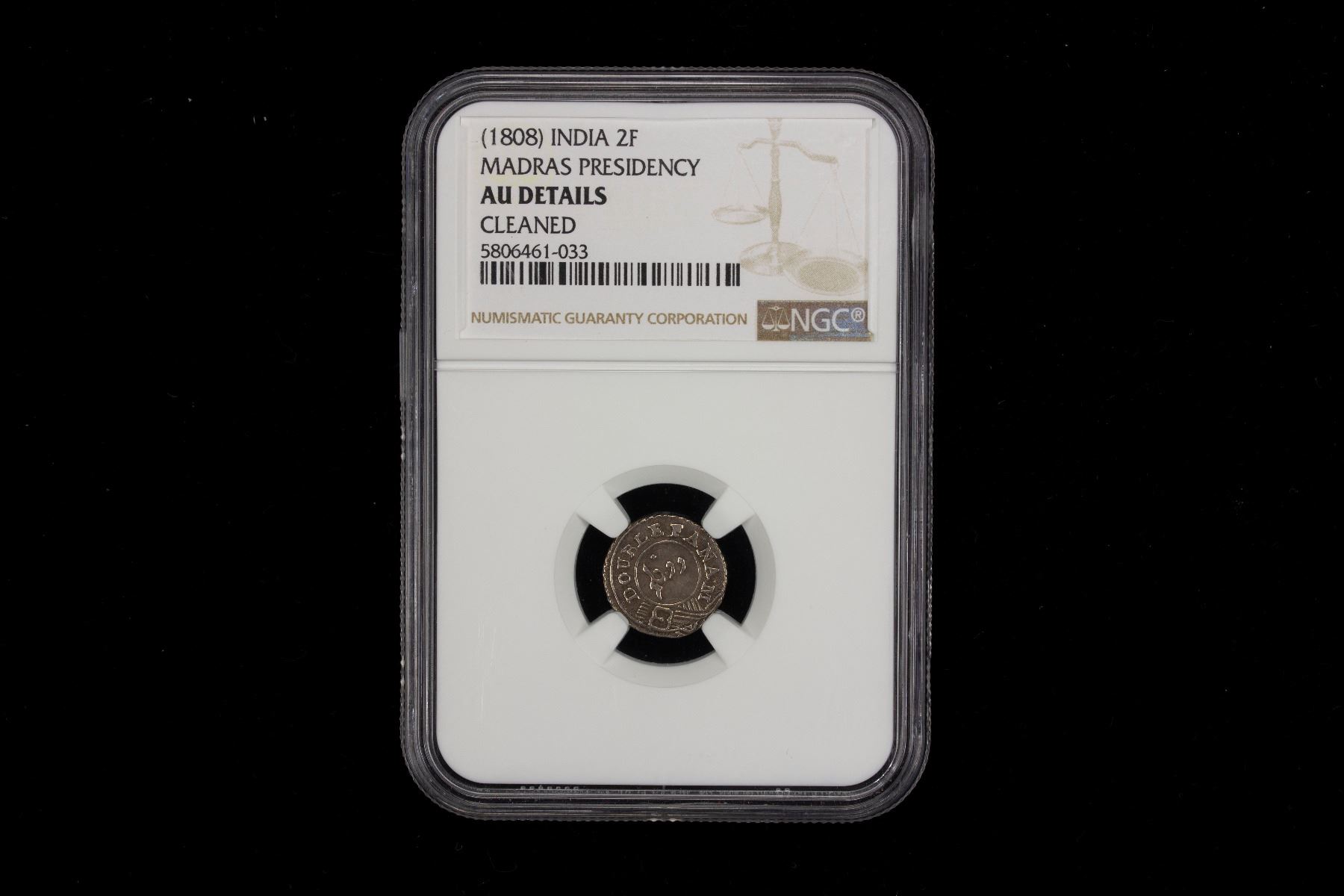 MADRAS PRESIDENCY: George III, 1760-1820, AR 2 fanams, ND (1808), KM-350var, Stevens-3.250, obverse variety with short oval buckle, correct spelling, two diacritical marks, no stop in legend, and no shading in buckle; reverse variety with inward Tamil legend, lightly cleaned, but attractive appearance, engrailed edge, NGC graded AU details.