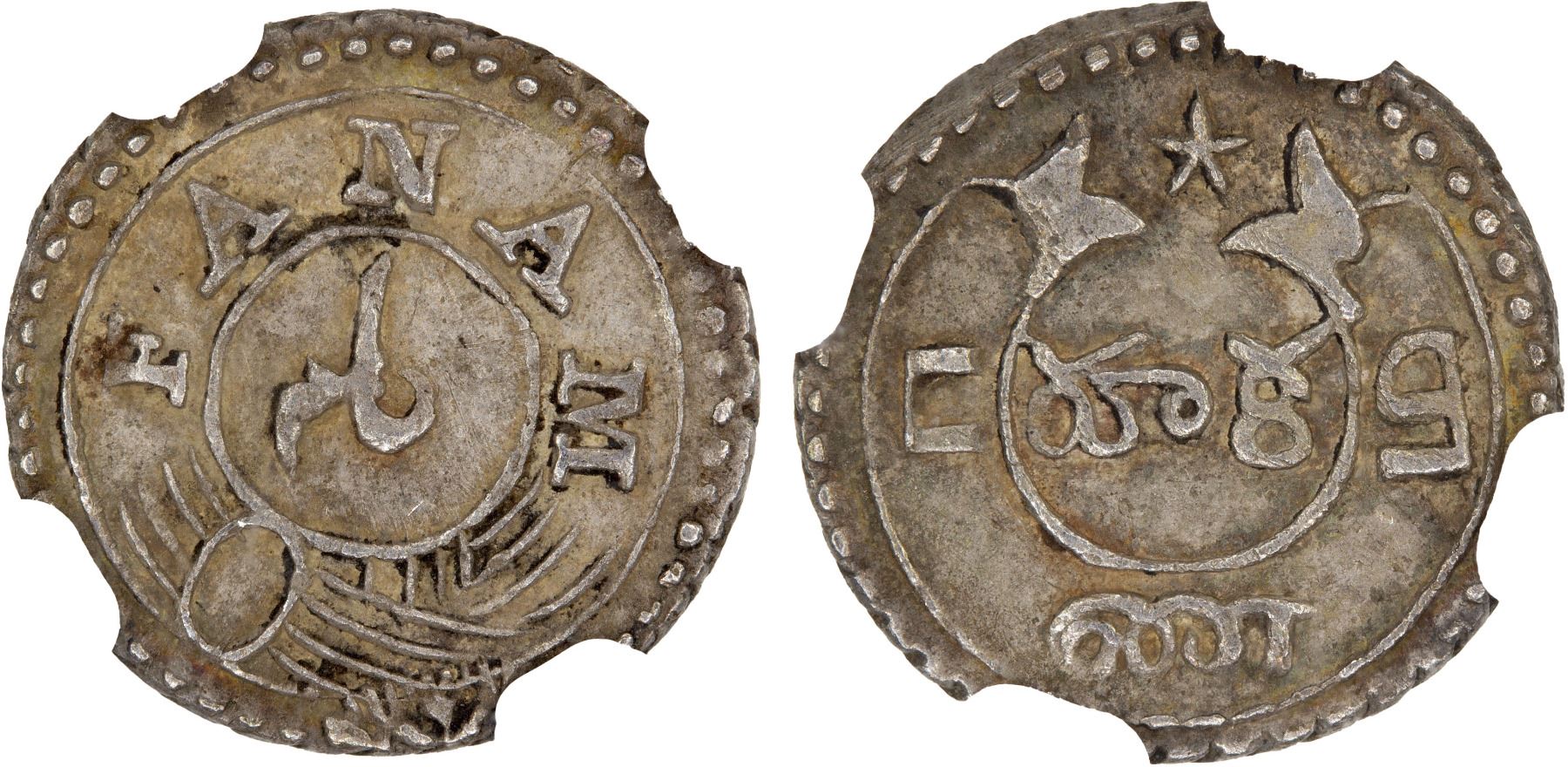 MADRAS PRESIDENCY: George III, 1760-1820, AR fanam, ND (1808), KM-349var, Stv-3.271., Stevens-3.271, better variety with round buckle, lightly toned, NGC graded AU53.