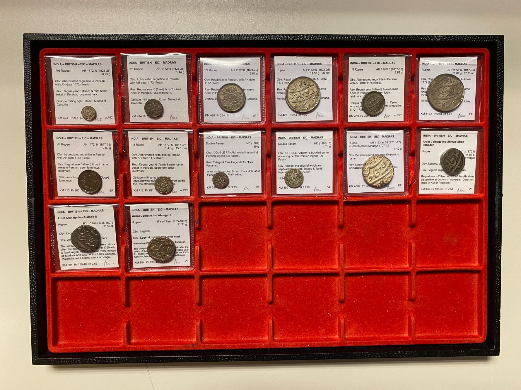 MADRAS PRESIDENCY: LOT of 14 silver coins, Chinapatan series: Stv-2.19, rupee AH1123/5 (1 pc, EF); Arcot series: Stv-2.63, rupee (2), Stv-2.64, rupee (1), average VF; Fanam series: Stv-3.73, double fanam (1), Stv-3.256, double fanam (1), both F-VF; Machine-struck series (dated AH1172 year 6 unless noted): Stv-4.21 1/4 rupee (dated 1176 instead of 1172), Stv-4.23 rupee, Stv-4.26 1/4 rupee, Stv-4.28 1/8 rupee, Stv-4.30 rupee, Stv-4.31 1/2 rupee, Stv-4.34 1/8 rupee, and Stv-4.35 1/16 rupee, mostly EF condition; all with Ian Todd's description; retail value $600, lot of 14 pieces, ex Ian Todd Collection.