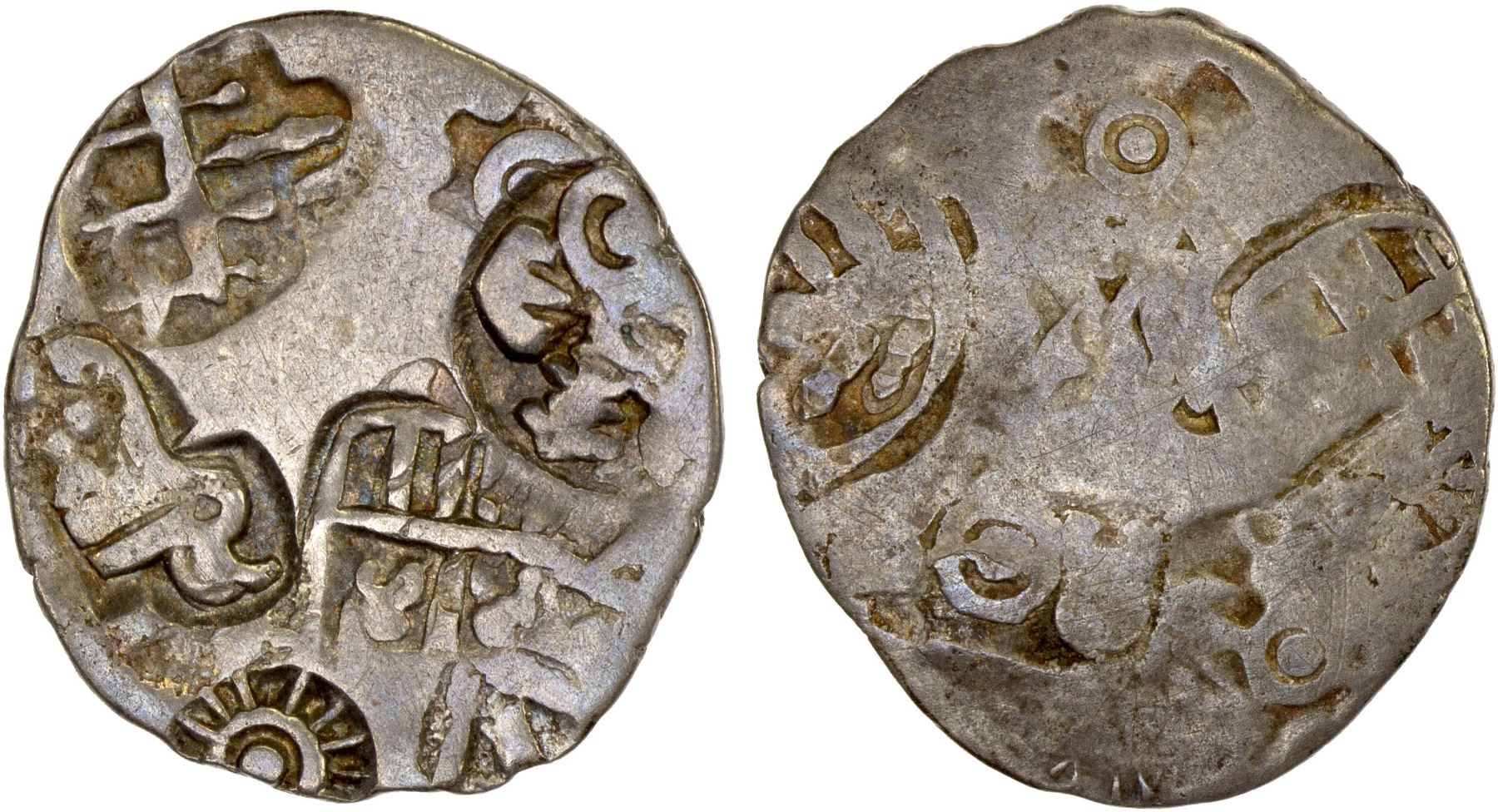 MAGADHA: Punchmarked, AR karshapana (3.17g), ca. 430-400 BC, Rajgor-362, five punches (sun, 6-arm symbol, elephant, plow with taurines, candelabrum), overstruck on another Magadha type with several punches on reverse, Choice VF.