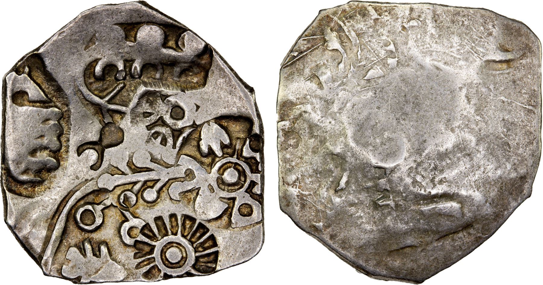 MAGADHA: Punchmarked, ca. 420-350 BC, AR karshapana (3.45), GH-188, Five punches: sun, 6-arm symbol, fish in decorative square, three taurines lined up together, damaru, and elephant, plus a few bankers' marks, including a taurine; reasonably well arranged punches, beautiful example, XF, R, ex Wilfried Pieper Collection.