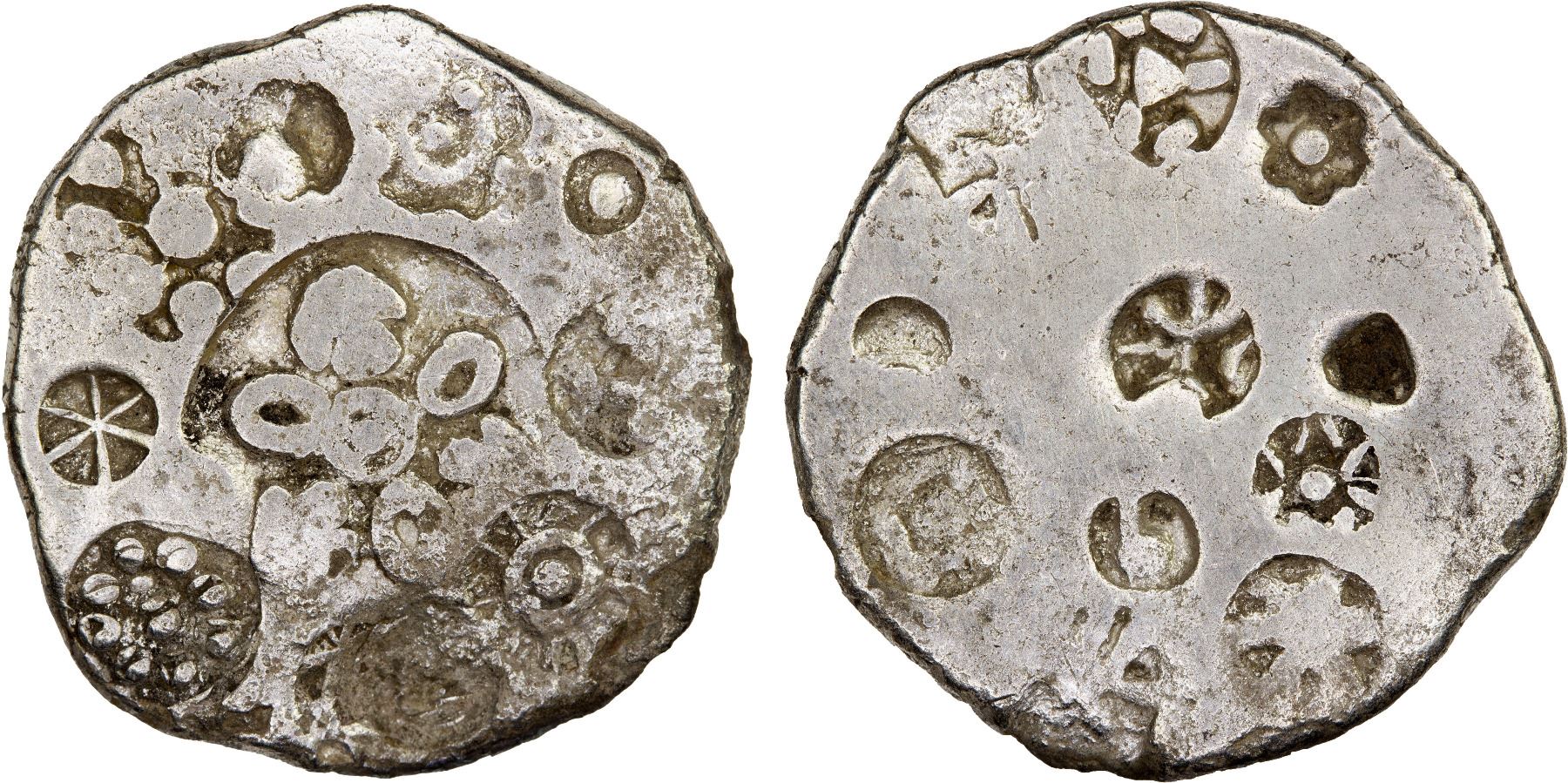 MAGADHA: Punchmarked, ca. 600-550 BC, AR 1/2 shatamana (5.02g), Ra-43, series 8, 6-armed symbol in center, surrounded by 9 banker's marks, plus 11 more banker's marks on reverse, extremely rare, minor porosity and cleaning, F-VF One of the earliest series of punchmarked coins of India.