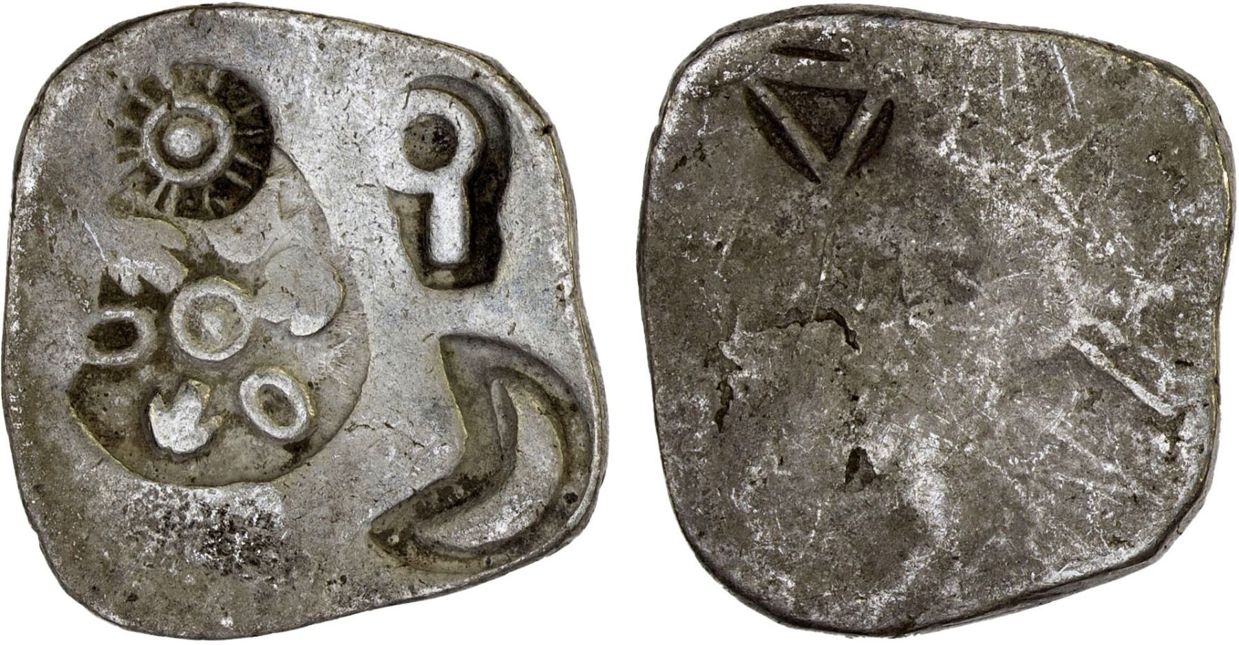 MAGADHA: Punchmarked, ca. 6th/5th century BC, AR 25 masha (5.27g), MATEC 2731-55, Magadha symbol plus sun, ladle, and crescent; 1 banker's mark on the reverse; earliest period of the Magadha coinage, lovely example, VF, R.