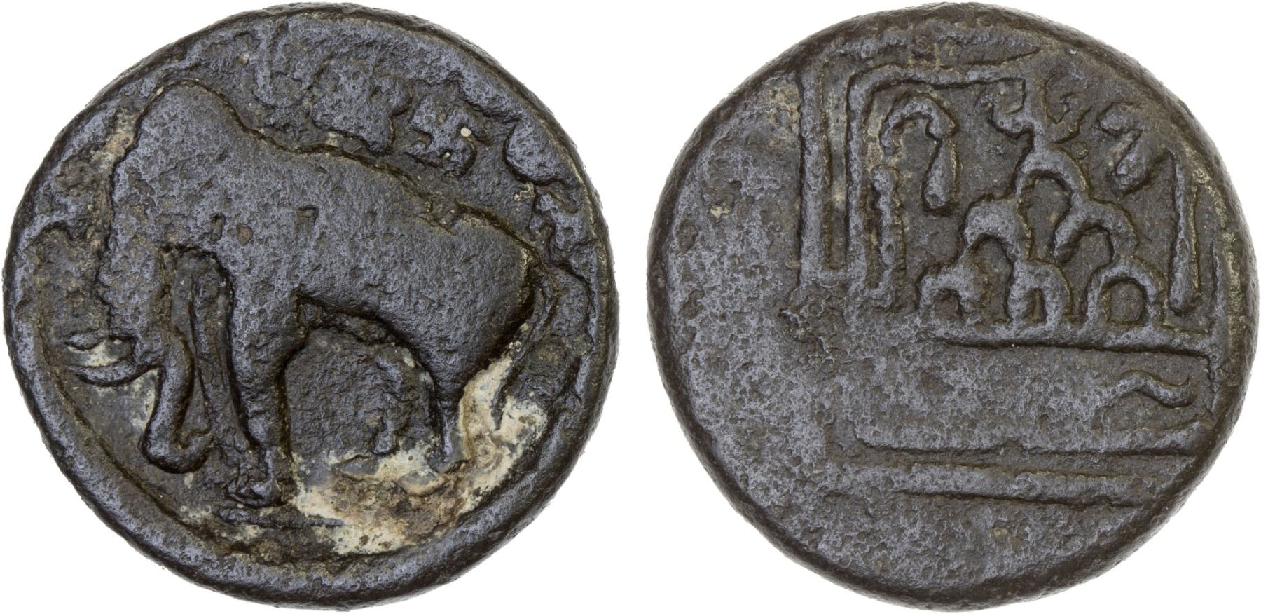 MAHARASTHIS: Shiva Mahahaathi, ca. 200-250 AD, AE broad unit (5.92g), Pieper-, elephant left, nandipada, srivatsa and swastika above // 6-arch hill, nandipada above, yupa left and palm tree right, river below, all within a rectangular border, VF, RRR.