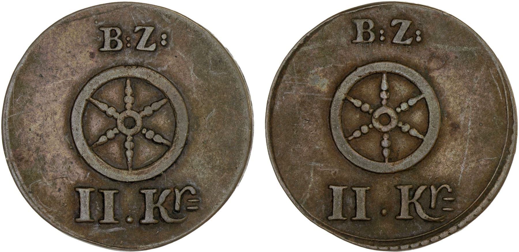 MAINZ: AE 2 kreuzer bridge token (2.87g), ND (ca. 1700's), B:Z: (spoked wheel) II.Kr-- / same as obverse, VF.