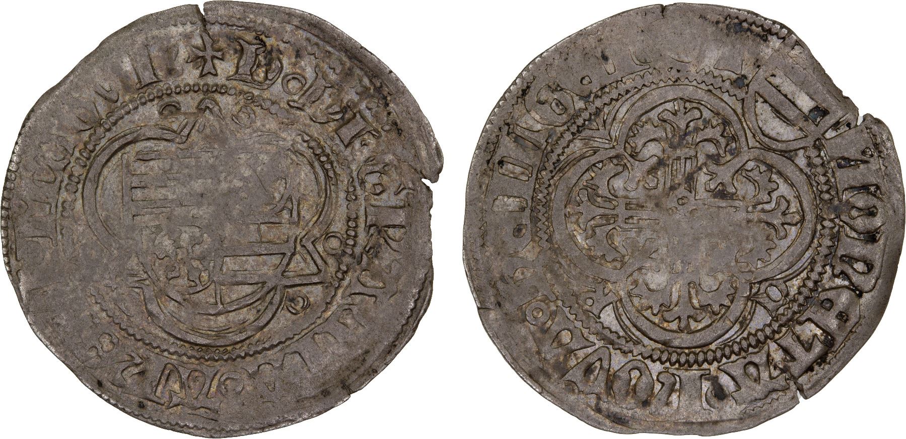 MAINZ: Dietrich II von Isenburg, 1475-1482, AR groschen (2.15g), Heiligenstädt, ND, Walther Coll.-164, Saurma-1262, Meissen style, four-fold arms (Isenburg/Mainz) in a double trefoil, with a ringlet in each corner, with "+D DI GRACIA ARCHI MAGVn" around // family coat of arms above floral cross with "C - R - V" in the corners and NOnETA NOVA HEILGEnST around all, small edge chip at 3:00, somewhat uneven strike, VF-XF, ex Joe Sedillot Collection.
