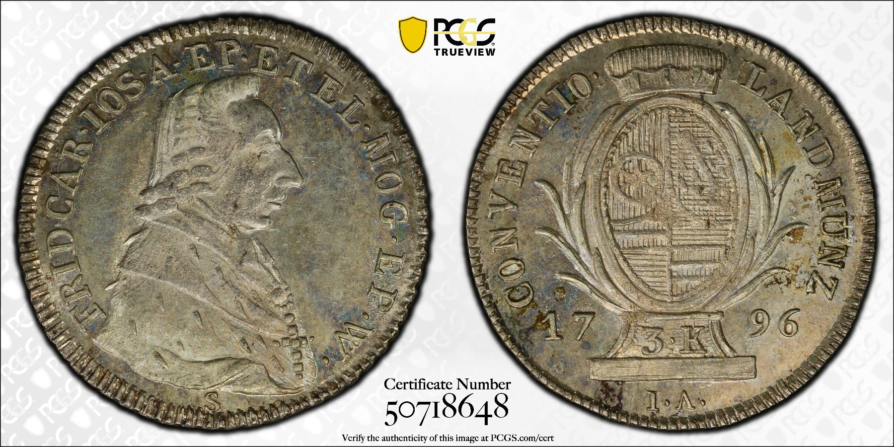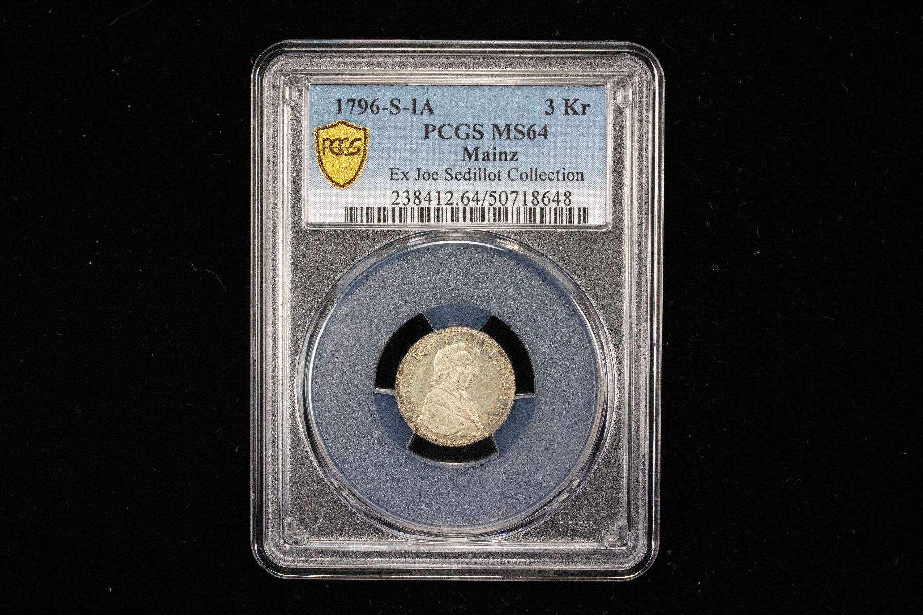 MAINZ: Friedrich Karl Joseph von Erthal, 1774-1802, AR 3 kreuzer, 1796-S, KM-413, mint master's initials IA, a scarce type, a wonderful lustrous mint state example, PCGS graded MS64, ex Joe Sedillot Collection. Finest graded 'top pop' by PCGS!Erthal's politics were dominated by the Enlightenment. The universities of Mainz and Erfurt were reformed according to new ideas, and a hymnal in German language was published. He became one of the most notable supporters of free-thought in theology and of Febronianism in the government of the Church. Georg Forster, a Protestant, became his librarian and William Heinse, another Protestant, and author of the lascivious romance "Ardinghello", was his official reader. Erthal suppressed the Carthusian monastery and two nunneries at Mainz and used their revenues to meet the expenses of the university, in which he appointed numerous Protestants and free-thinkers as professors. Notorious unbelievers such as Felix Anthony Blau and others were invited to the university in 1784 to supplant the Jesuits in the faculty of theology.