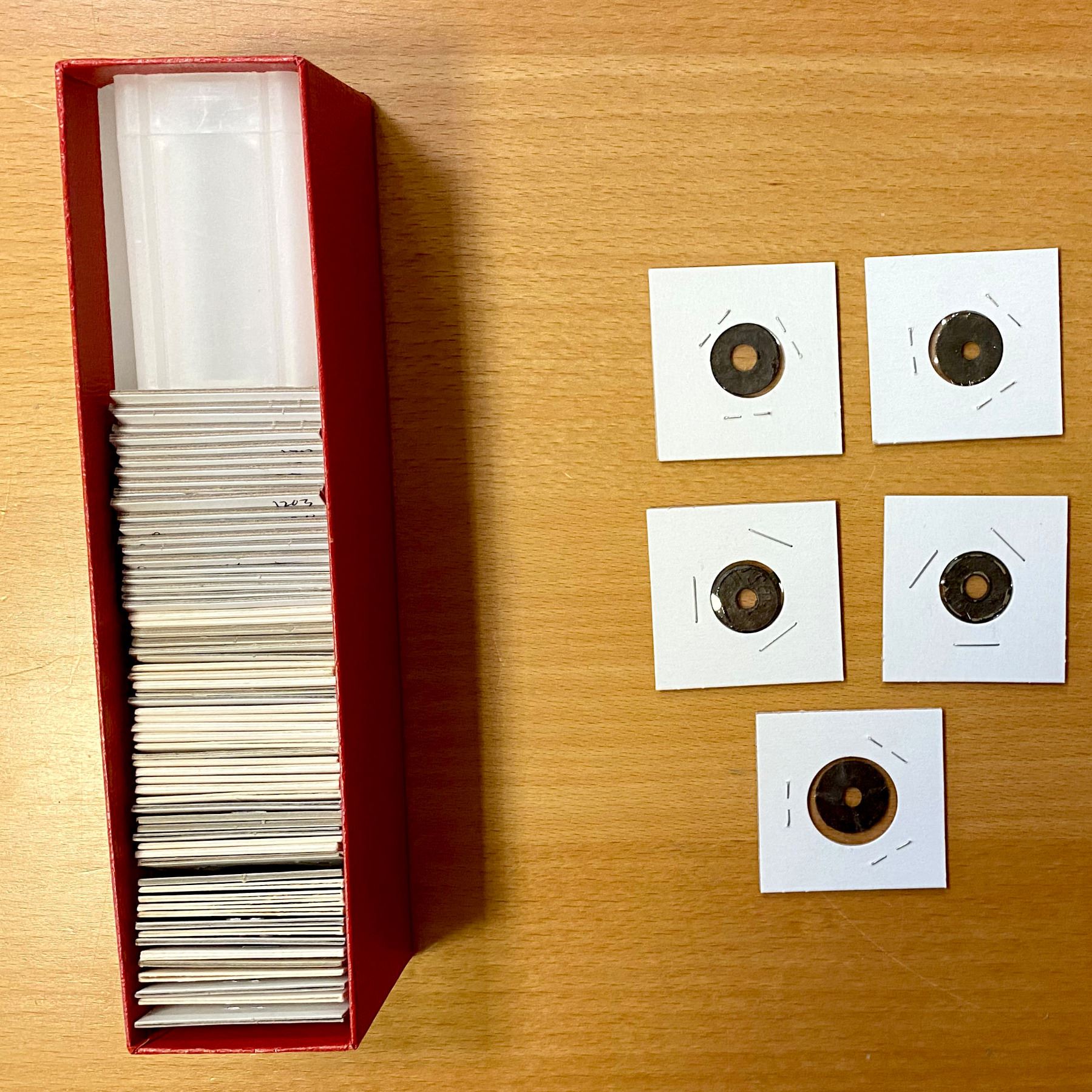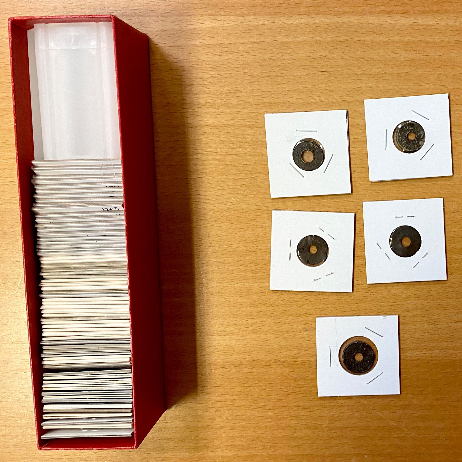 MALAY STATES: LOT of 69 tin coins, including 48 katuns from Johor (mostly the bar-type cf. SS-24 and 26, with a few other types) and 21 pitis from Palembang (some with various dates, as well as an example under British occupation); average circulated grades, many with reasonably clear inscriptions and some quite nice, others rather worn and a few broken; retail value $500, lot of 69 pieces.
