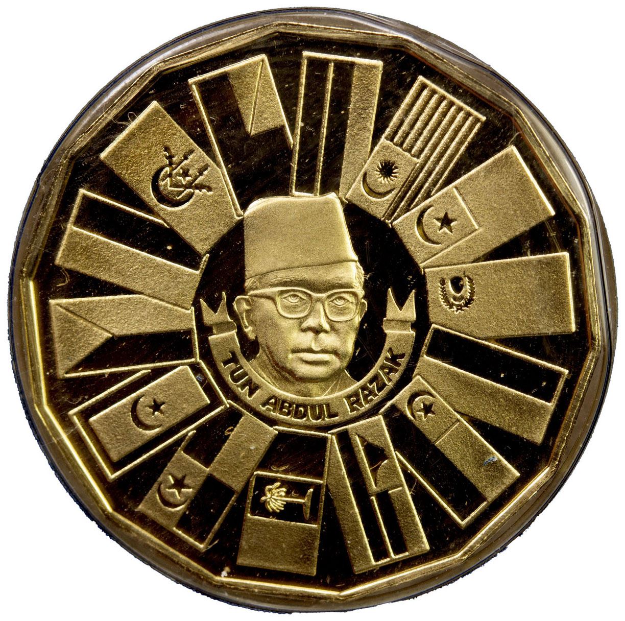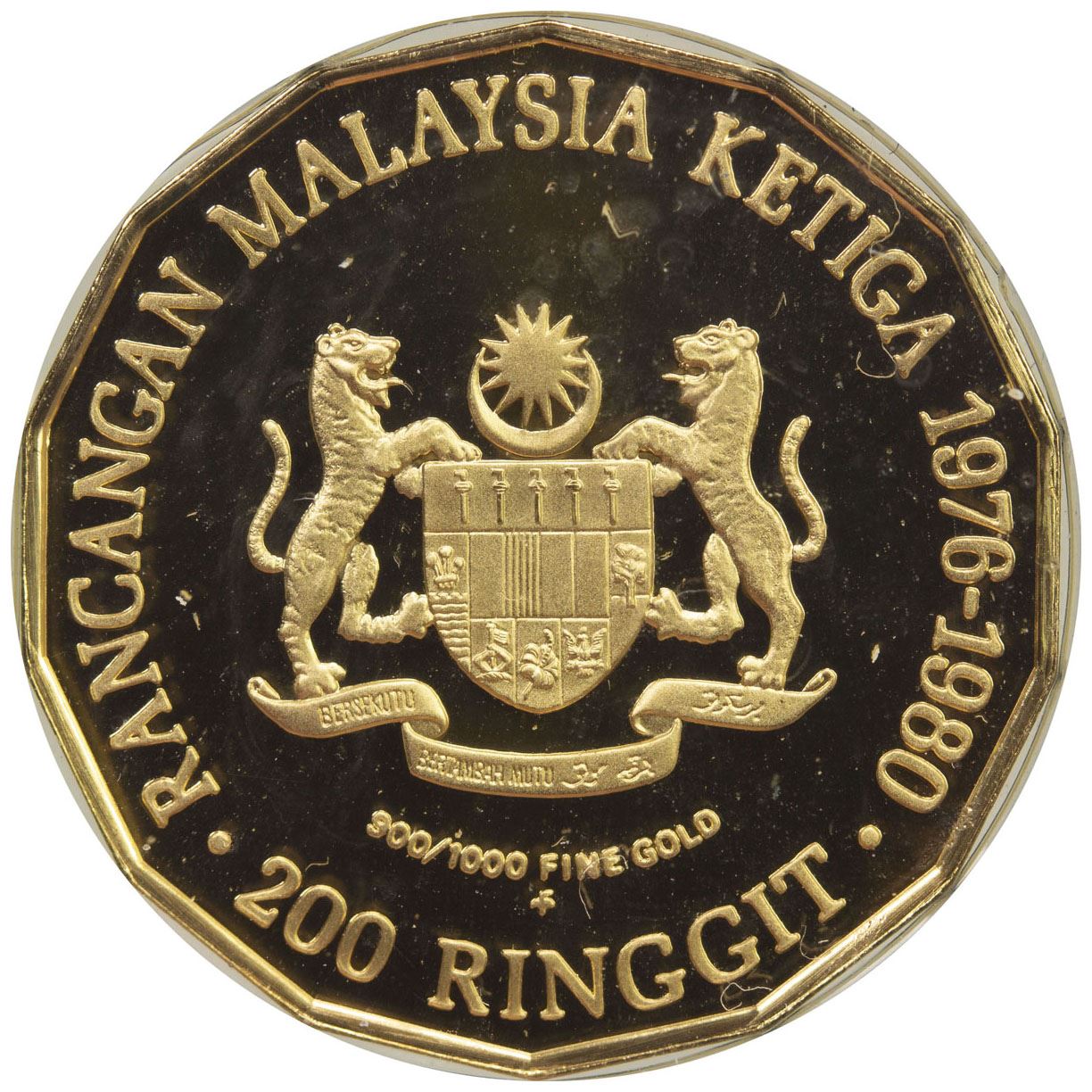 MALAYSIA: AV 200 ringgit, 1976-FM, KM-18, Schön-66, 3rd Malaysian 5-Year Plan, 14-sided, in original Franklin Mint case of issue with COA, Proof.