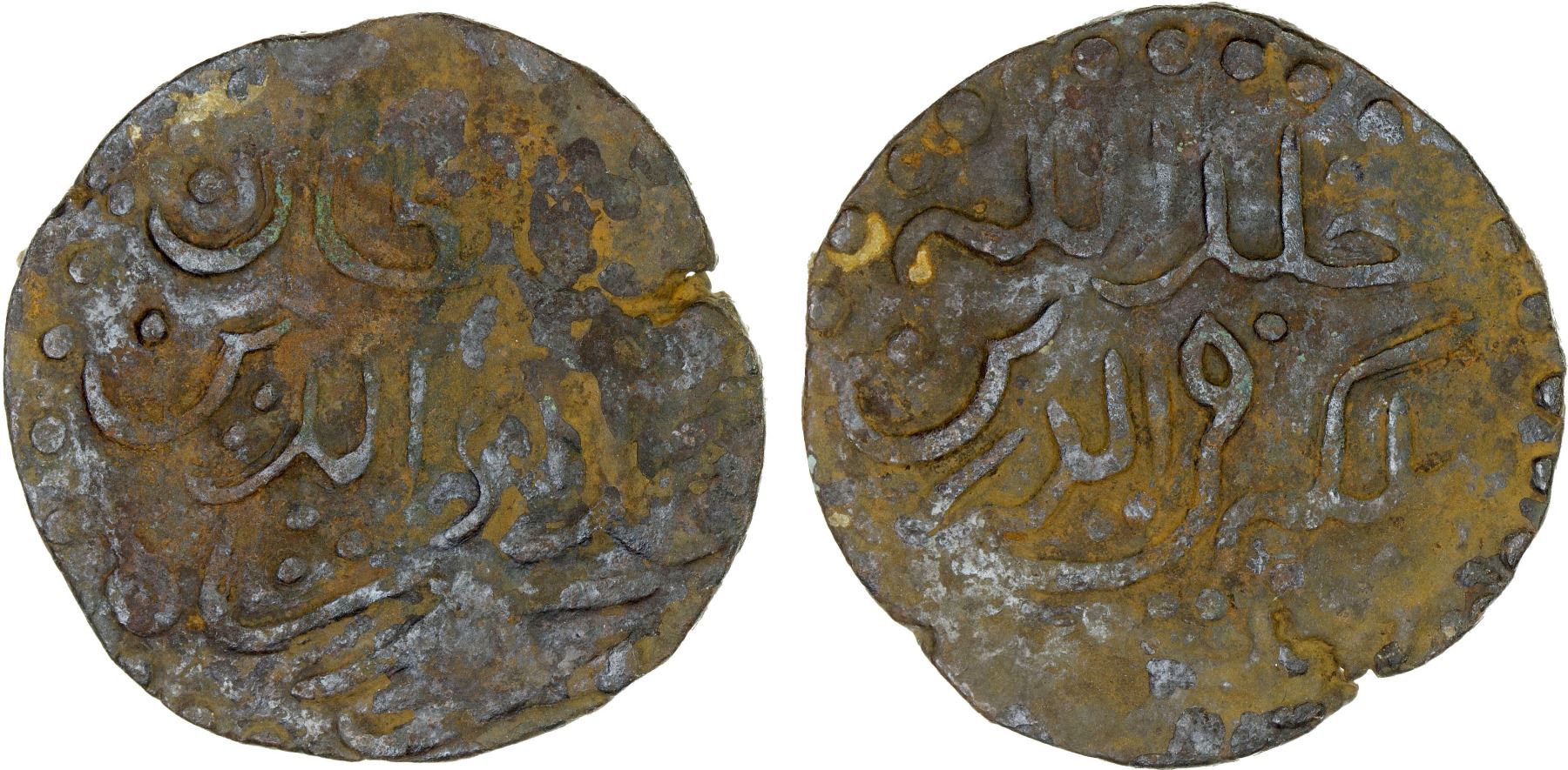 KEDAH: Ala'uddin, ca. 17th century, silvered tin tarra (9.27g), SS-5A, al-sultan `ala' al-din mukaram shah // khallada Allah mulkahu fi al-din wa-'izzahu ("May Allah perpetuate his reign in the religion and his glory"), some discoloration, VF, RRR. This example is the same type as the plate example of SS-5, though Singh gives a different ruler's name (Zia'uddin) and a completely different reading of the reverse side. Similar to the otherwise unknown Awaluddin (cf. our Auction 41, Lot 1445), there is no Ala'uddin among the list of rulers of Kedah. This coin is one of the only two examples we are aware of beside Singh's plate example.