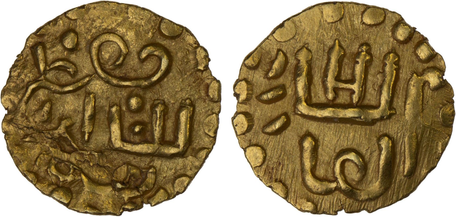 KEDAH: Mu'azzam Shah, 1179-1201, AV kupang (0.65g), SS--, Prid--, Jawi legend mu'azzam / al-sultan / (shah?) // al-sultan / al-'adil, scrape and slight crimp on obverse, lightly lustrous unpublished and apparently unique, Choice AU. This is the first coin of this ruler and the earliest coin from Kedah that our firm has encountered.