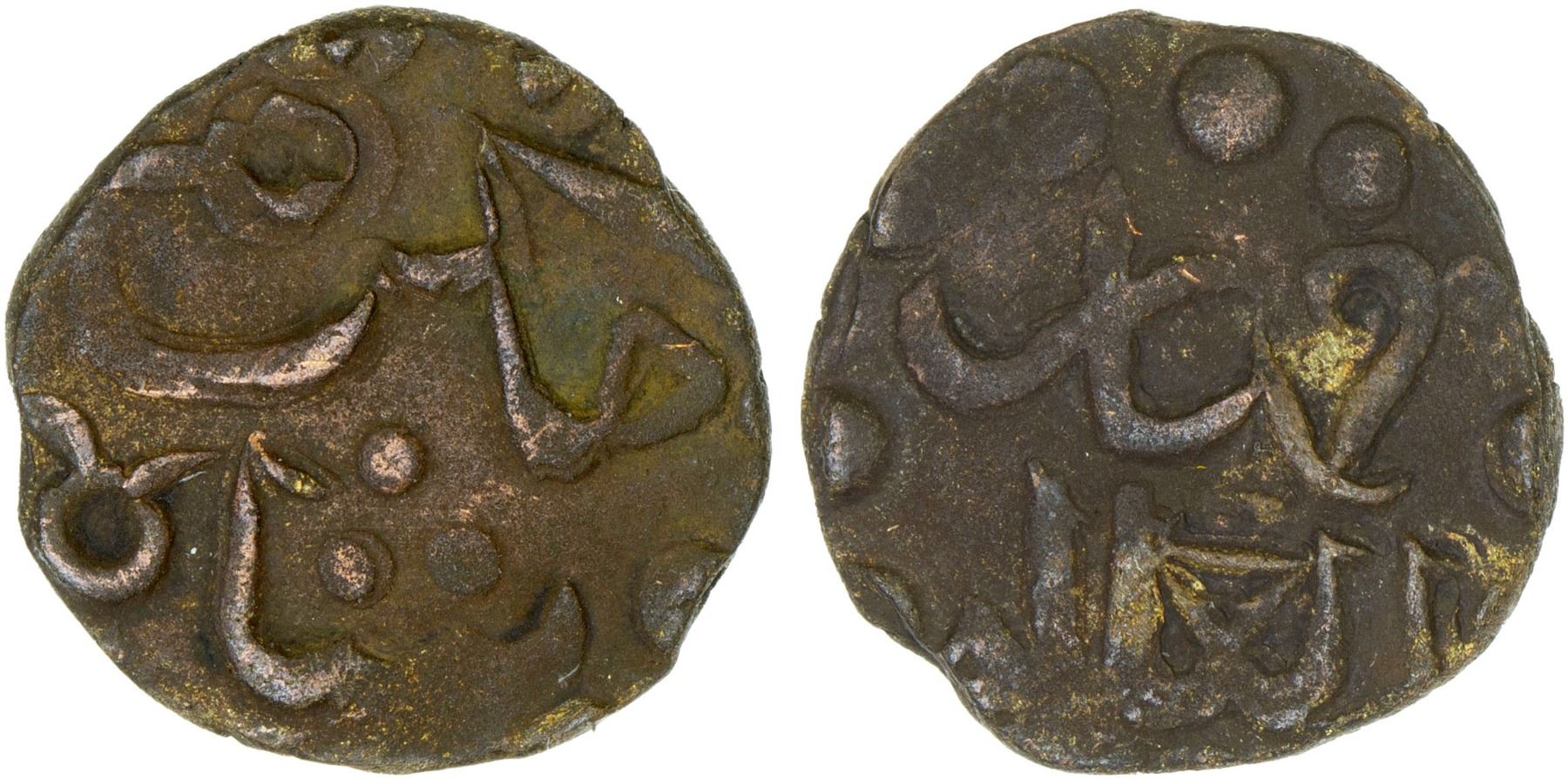 KEDAH: Zia'uddin al-Mukarram Shah, 1661-1687, AE tarra (1.41g), ND, SS--, Millies--, mukarram shah // qahar al-'alam ("conqueror of the world"), unpublished, VF, RRR. We tentatively attribute this issue to Zia'uddin, as there are coins in name bearing dates after his death. It is unclear whether the lofty epithet on the reverse was intended for the sultan or a higher power.