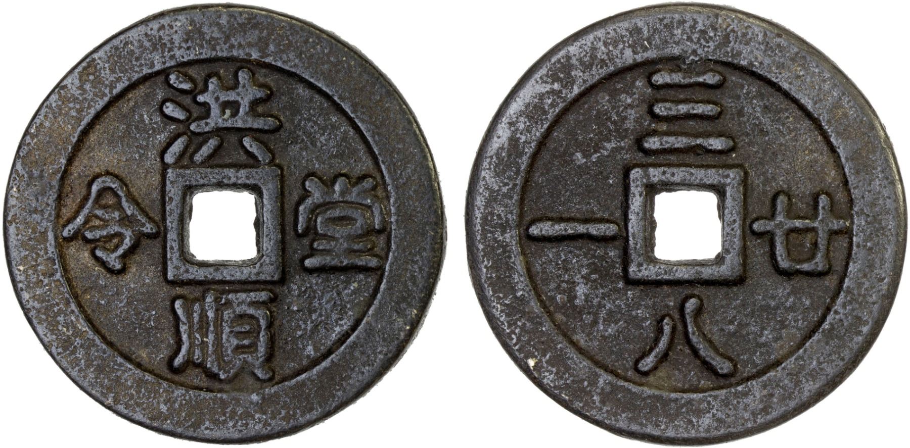MALACCA: Hongmen, AE membership token (17.70g), ca. 1946-48, 35mm, hong shun tang ling ("order of Hong Shun Hall") // san ba nian yi ("three eight twenty-one", i.e. components of the character hong in Hongmen), used as identification by members of Hong Shun Hall, a section of Hongmen responsible for communications and dispatching letters, who are also known as "straw sandal" (cao xie), Choice VF. This is one of the six known types of Hongmen tokens. For a detailed background on this secret society and its tokens, please visit dniewcollectors.blogspot.com/2013/05/hong-men-chenese-secret-society.html.
