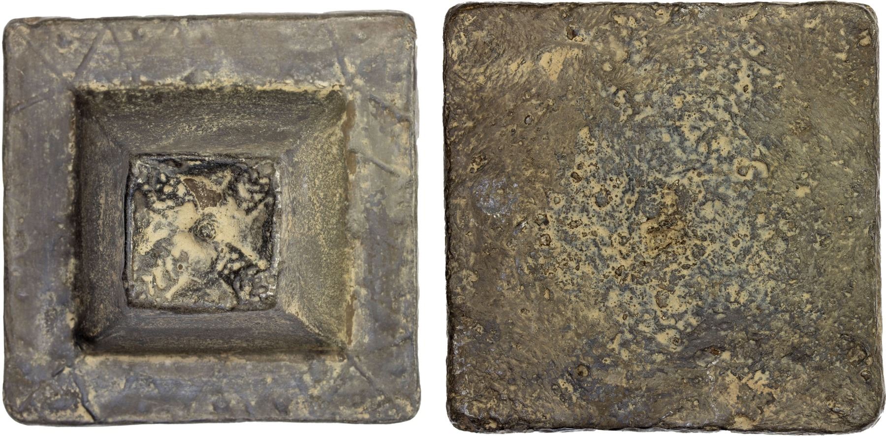 PERAK: tin ingot (214.07g), ca. 18-19th century, SS-27, 58 x 59 x 22mm, pyramid-type solid ingot, known locally as "bidor", four-leaf mangosteen rosette pattern (tampok manggis) on top, triangular patterns with pellets on plinth, a very decently cast example, Choice VF.