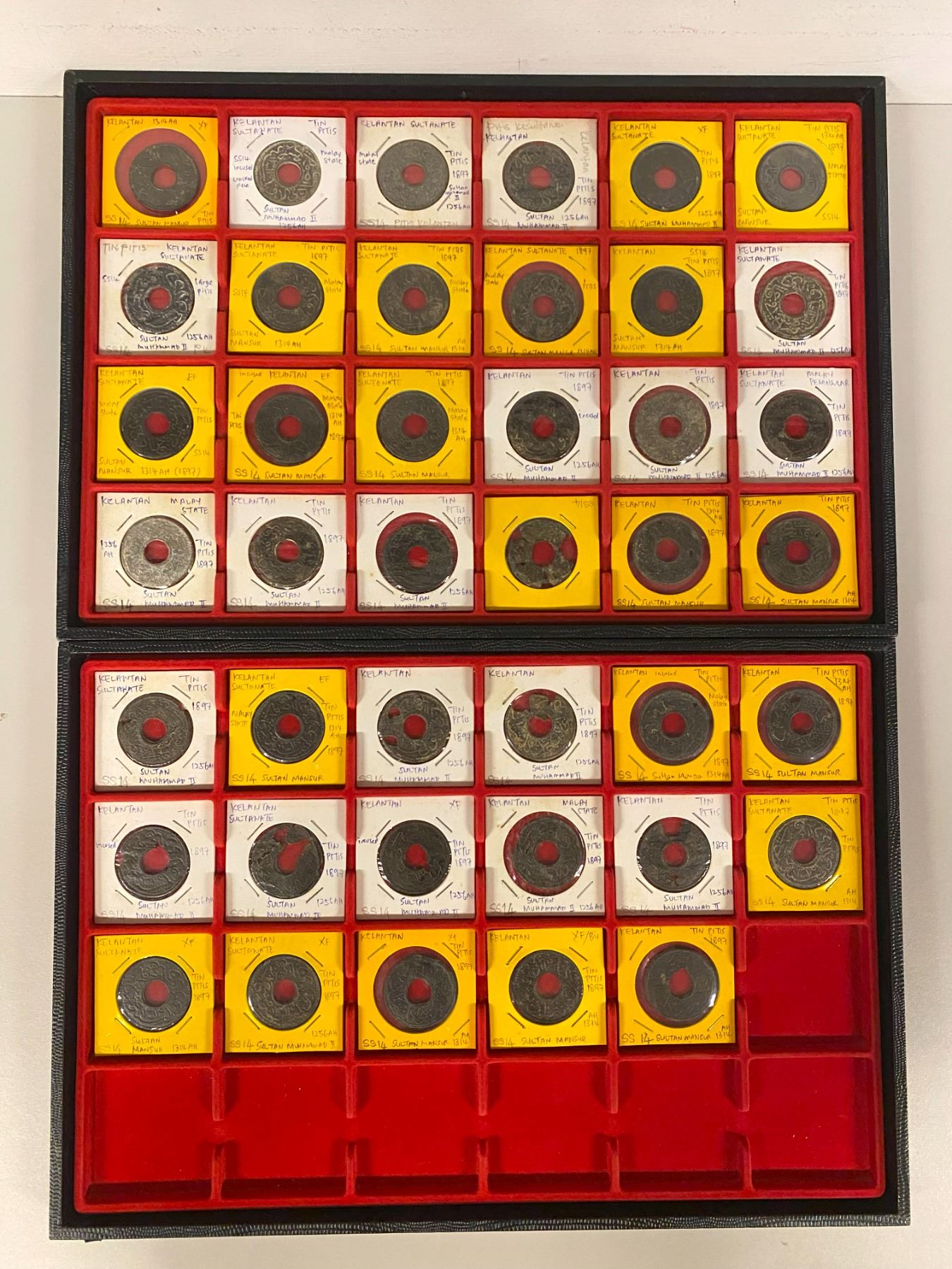 KELANTAN: Mansur, 1891-1900, LOT of 41 tin pitis, AH1314, SS-14, average VF grades, about half with casting holes or edge chips, a few EF with pleasing surfaces; retail value $400, lot of 41 pieces.