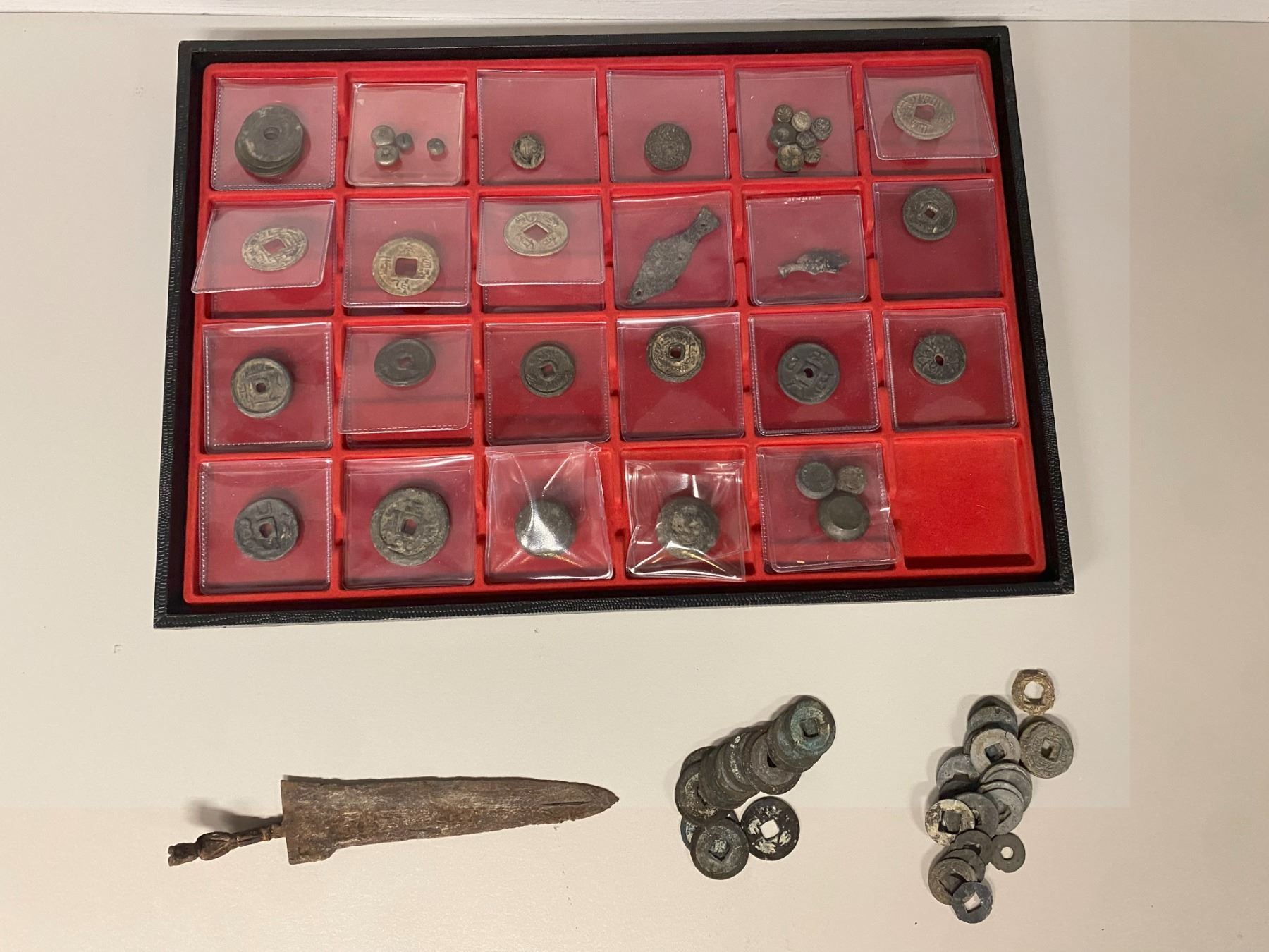 MALAY STATES: LOT of 78 items, a diverse group, including Coins (61): 4 Bangka jokohs, 4 Kalah silver-paktong units with different reverse symbols ("namo"; cf. Zeno-295315), 9 unidentified Sumatran tin pieces (most small piloncitos with various designs), 44 Chinese cash coins and local imitations (incl. 4 Southern Han lead qian yuan zhong bao found in Indonesia; some pieces crusty and chipped); Ingots (2): two Perak-style fish money (cf. SS-66); Charms (9): incl. 5 from the same series as Zeno-286952 / Millies-109; Weights (5): a set of 5 Javanese drum-shaped weights (from 4.7g to 39.8g, or one suvarna, cf. Wicks 1992 p.255); plus a Javanese iron dagger with a sharp 13cm-long blade with a handle in the shape of a human figure; most in average circulated conditions, a very interesting group; retail value $400, lot of 78 pieces, ex Jürgen M. Wilmes Collection.