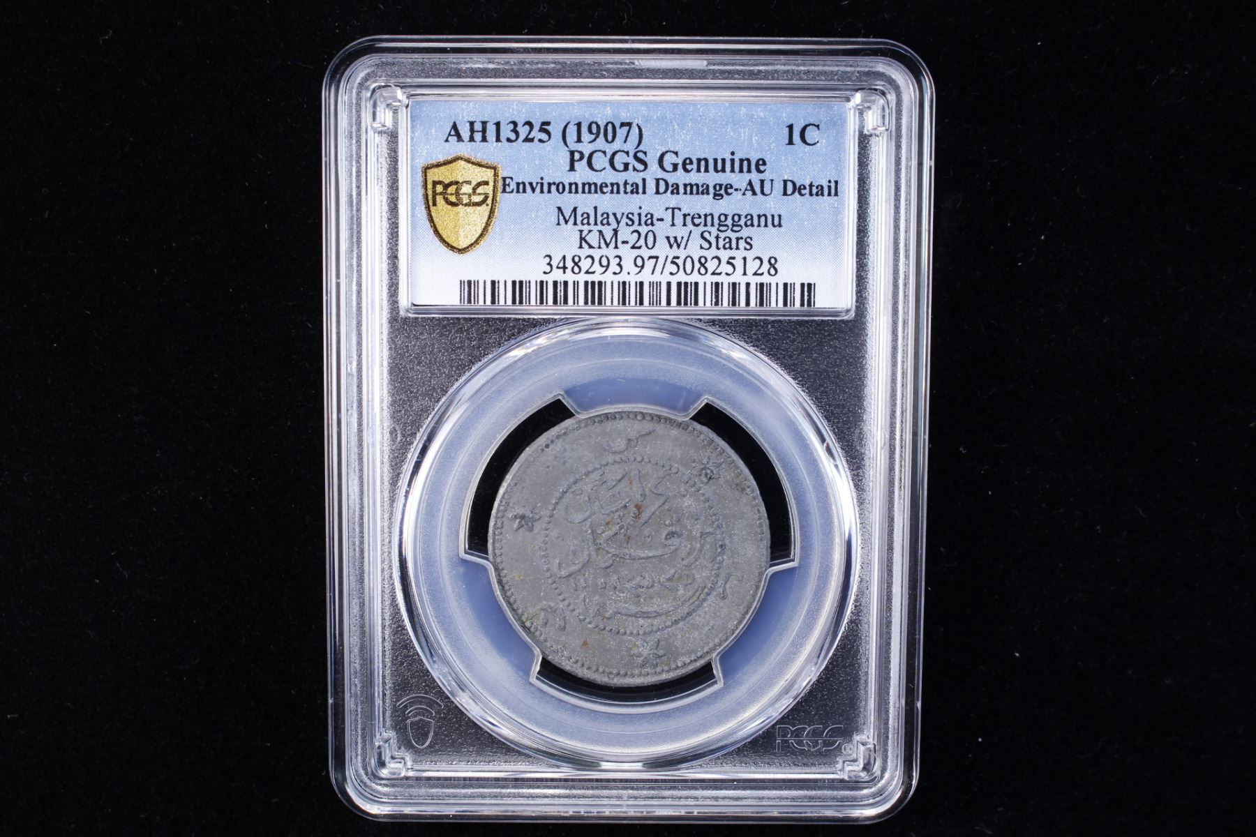 TRENGGANU: Sulaiman Badrul Alam Shah, 1920-1942, 1 cent, AH1325 (1907), KM-20, SS-23, variety with stars, a well-struck example, environmental damage as usual for this type, PCGS graded AU details, ex Howard A. Daniel III Collection.