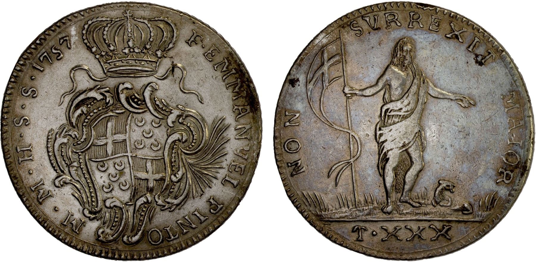 SOVEREIGN MILITARY ORDER OF MALTA: Emmanuel Pinto, 1741-1773, AR 30 tari, 1757, KM-256, Dav-1600. Cr-19, cleaned, starting to retone, XF, ex Dr. Vincent John Adams Flynn Collection.