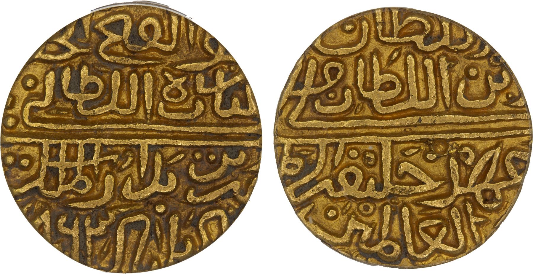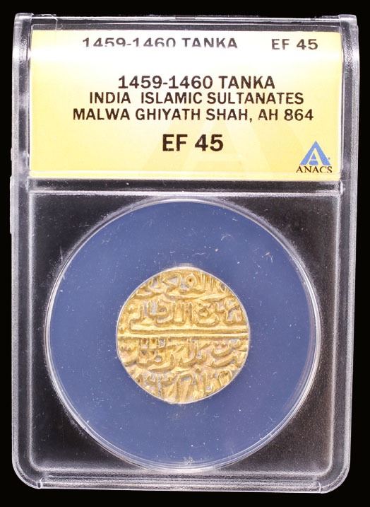 MALWA: Ghiyath al-Din, as heir apparent 1456-1469, AV tanka, Shadiabad, AH863, G-M50, date unknown to Goron, who cites the type only for AH861 and 862, ANACS graded AU50. Date incorrectly called 864 on the slab.