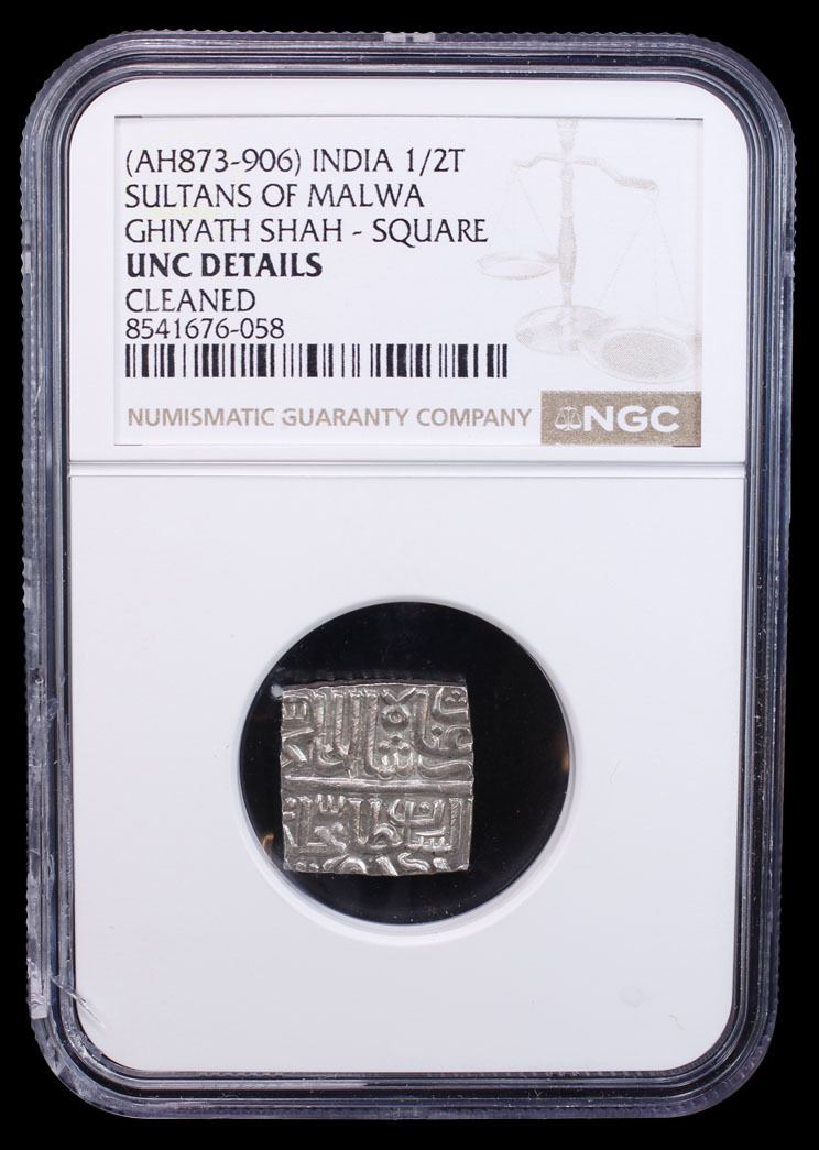 MALWA: Nasir Shah, 1510-1519, AR 1/2 tanka, DM, G-M110, misattributed on the slab to the previous ruler Ghiyath al-Din; cleaned, NGC graded UNC details.