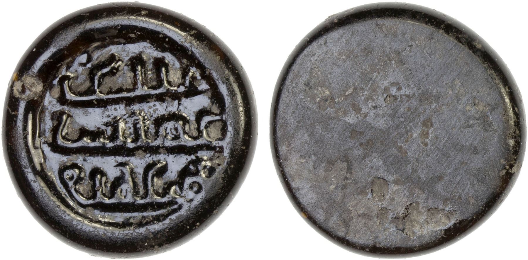 MAMLUK: glass weight (jeton) (3.04g), A-1046, undeciphered personal name; dark purple brown with trace of translucence, VF, ex SARC Auction 12, lot 358, ex Ismail al-Imam Collection.