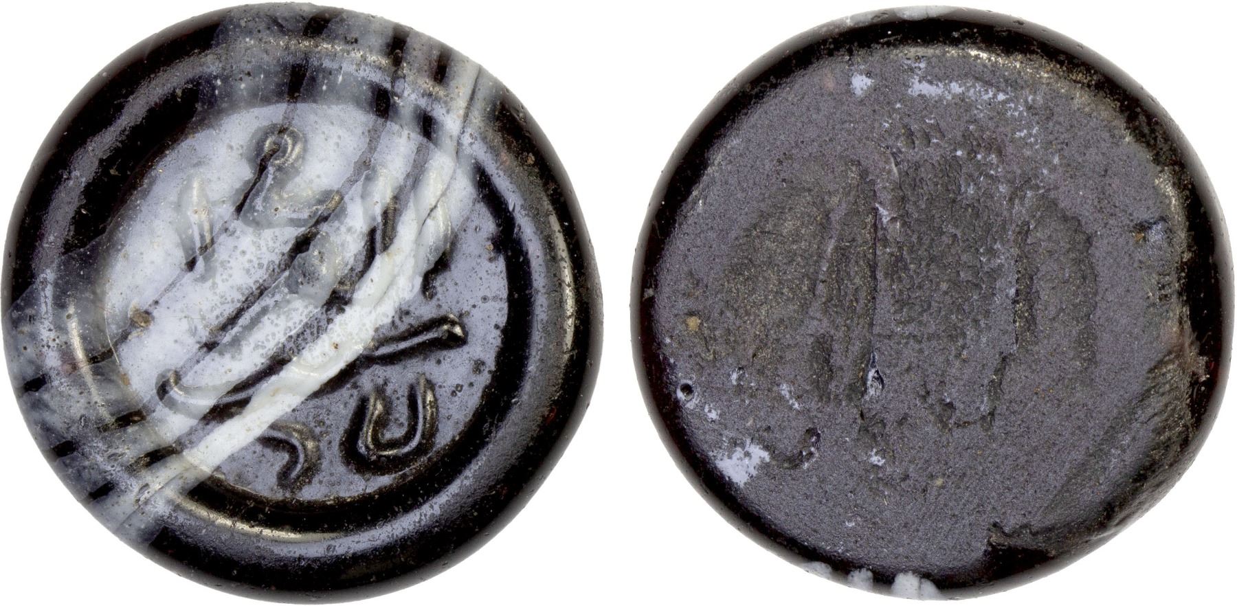 MAMLUK: glass weight (jeton) (3.04g), A-1046, undeciphered personal name; amazing colors: dark brown with four lines of white across the entire piece, XF, ex SARC Auction 12, lot 363, ex Ismail al-Imam Collection.