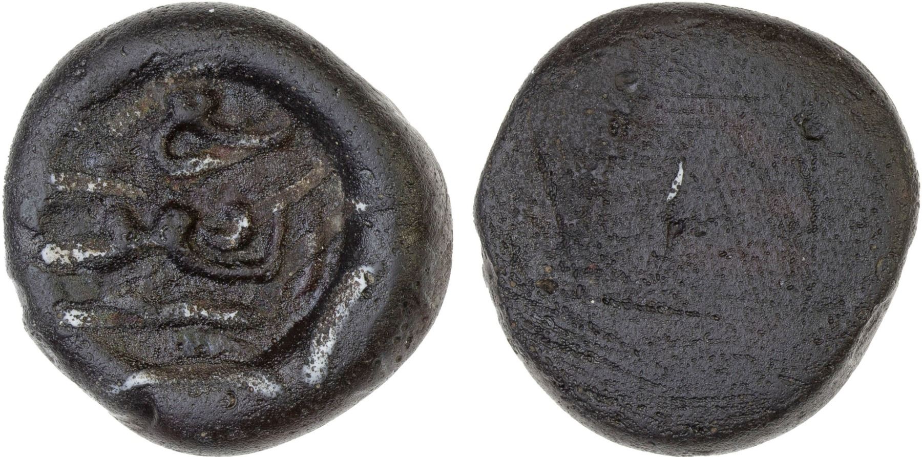 MAMLUK: glass weight (jeton) (5.58g), A-1046, undeciphered personal name; dark purple brown with trace of translucence, VF, ex SARC Auction 12, lot 367 (incorrectly assigned to Muhammad al-'Awdi - the name is totally different), ex Ismail al-Imam Collection.