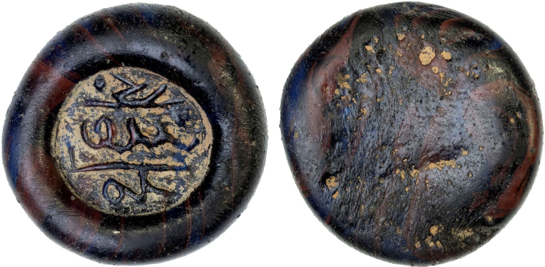 MAMLUK: glass weight (jeton) (6.08g), A-1046, undeciphered name, blank reverse; reddish brown, opaque; lovely example, bold VF, ex Ismail al-Imam Collection.