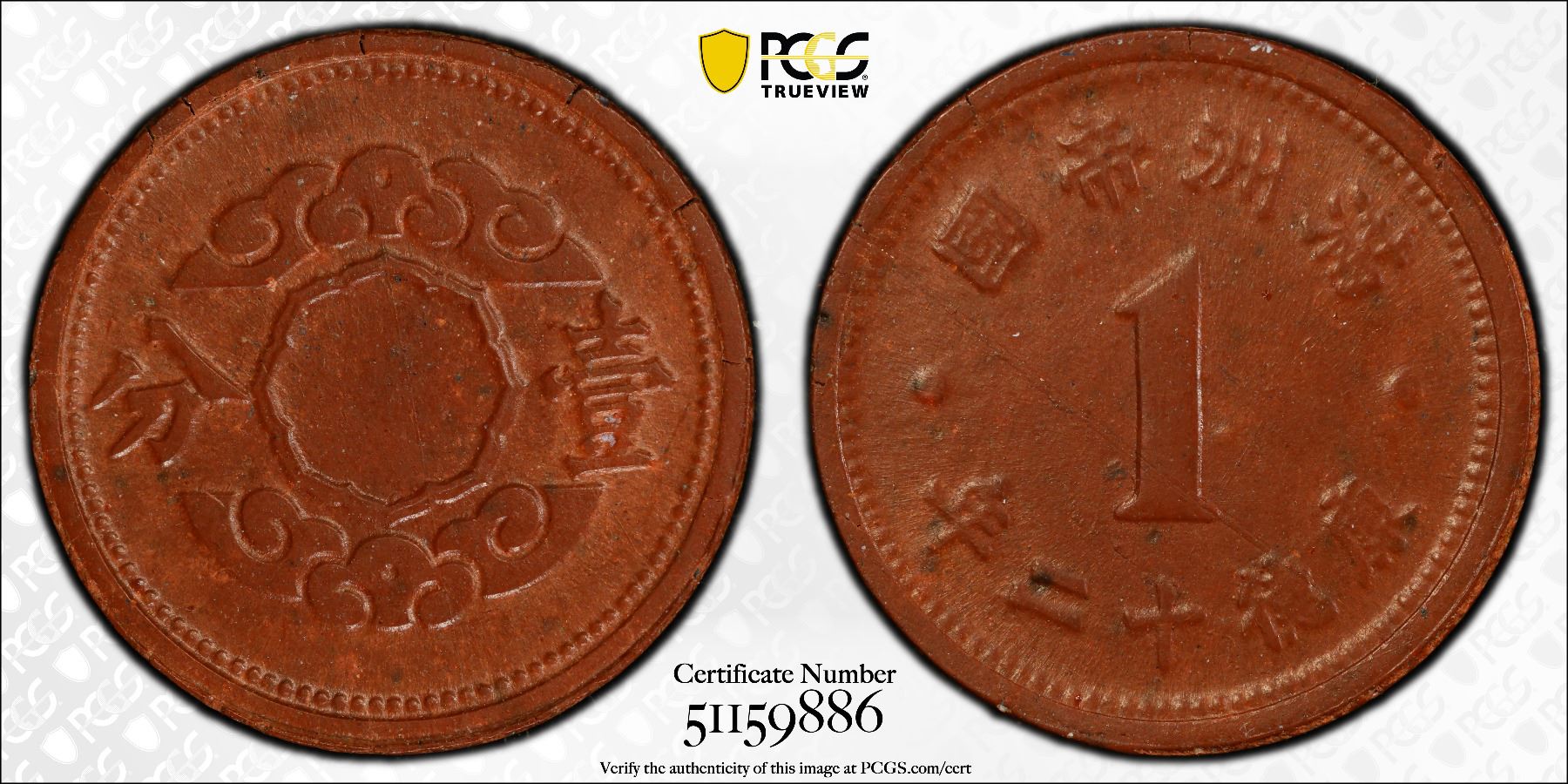 MANCHUKUO: K'ang Te, 1934-1945, 1 fen, year 12 (1945), Y-13a, JNDA-20-12, red fiber, a lovely example, PCGS graded MS63.