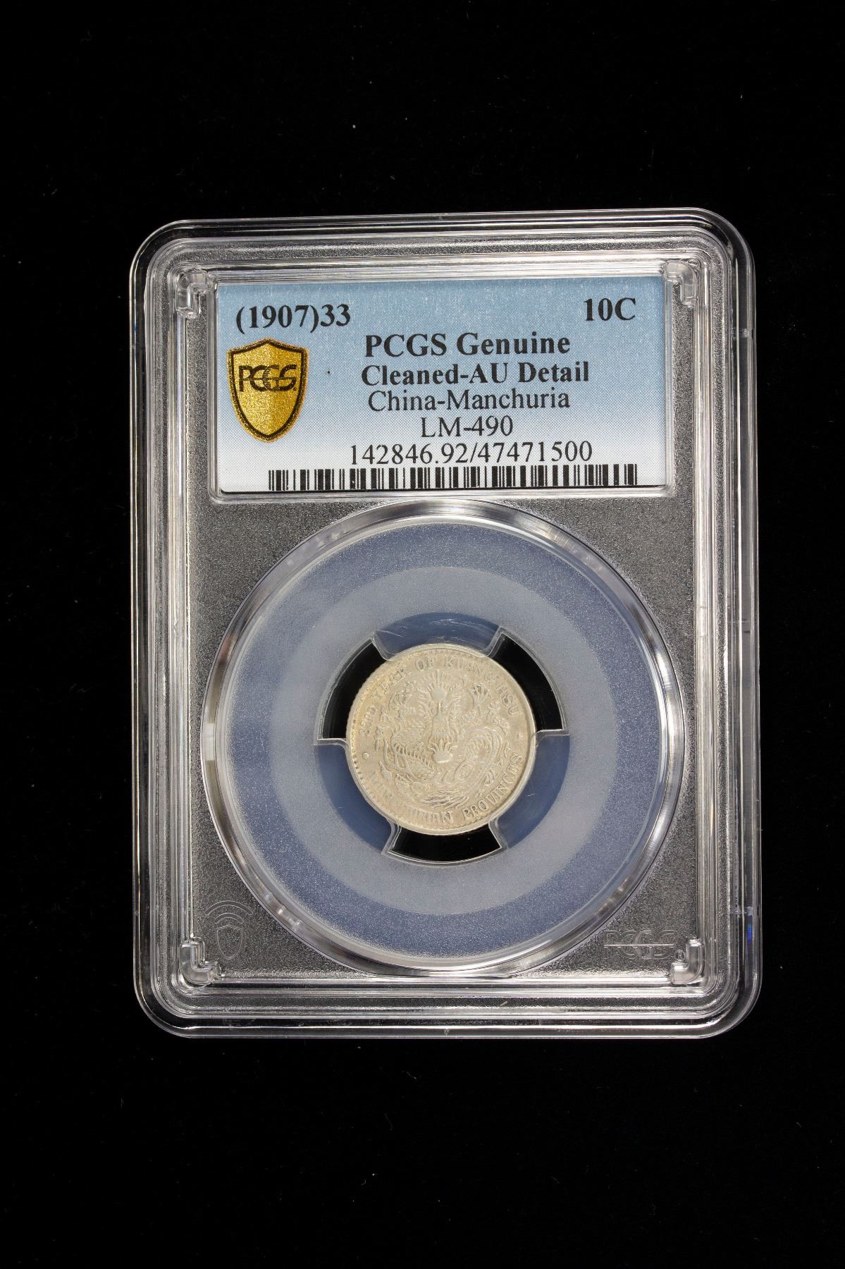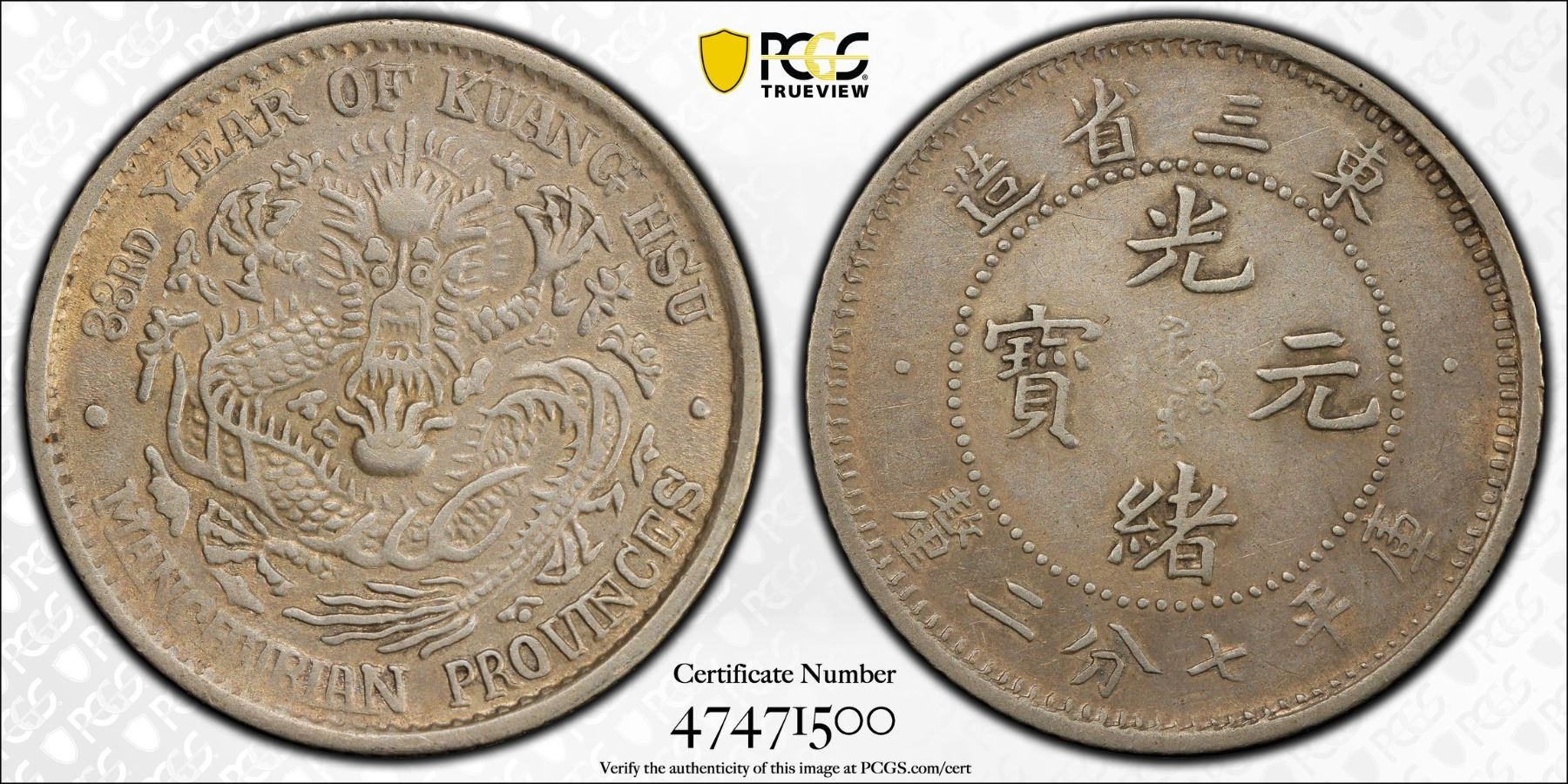 MANCHURIAN PROVINCES: Kuang Hsu, 1875-1908, AR 10 cents, year 33 (1907), Y-209, L&M-490, some hairlines, PCGS graded AU Detail.
