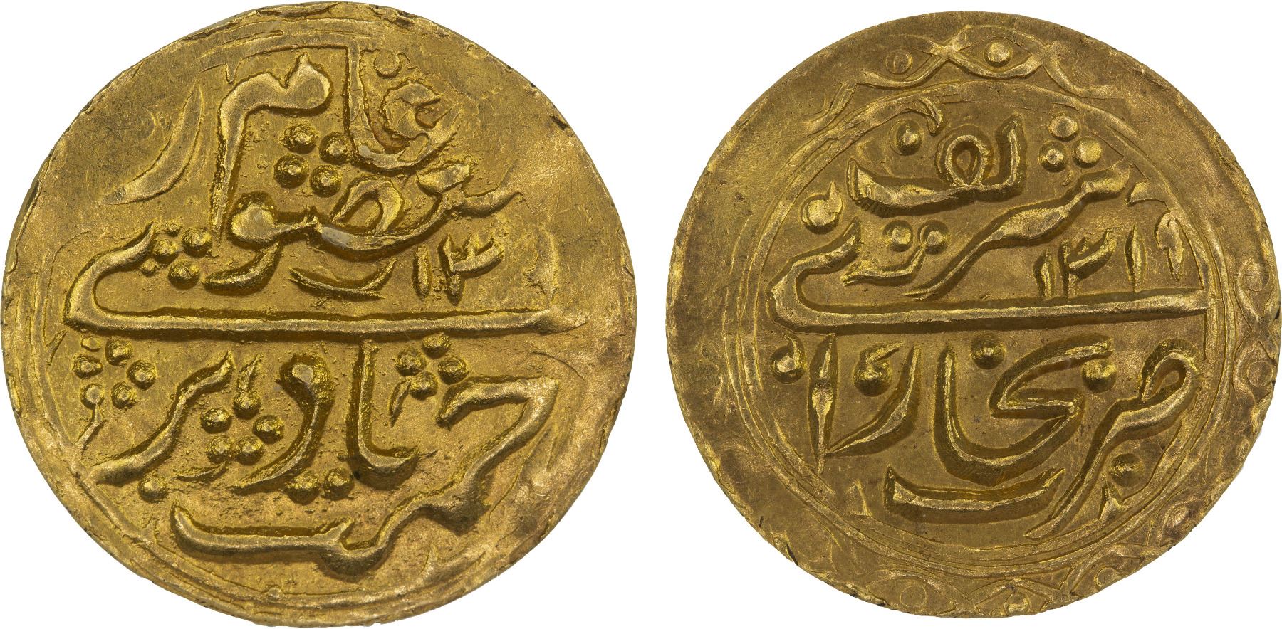 MANGHIT OF BUKHARA: 'Abd al-Ahad, 1886-1910, AV tilla, Bukhara-yi Sharif, AH139//1319, A-3041, Y-3, "139" is an error for "1319" on the obverse, ANACS graded MS63.