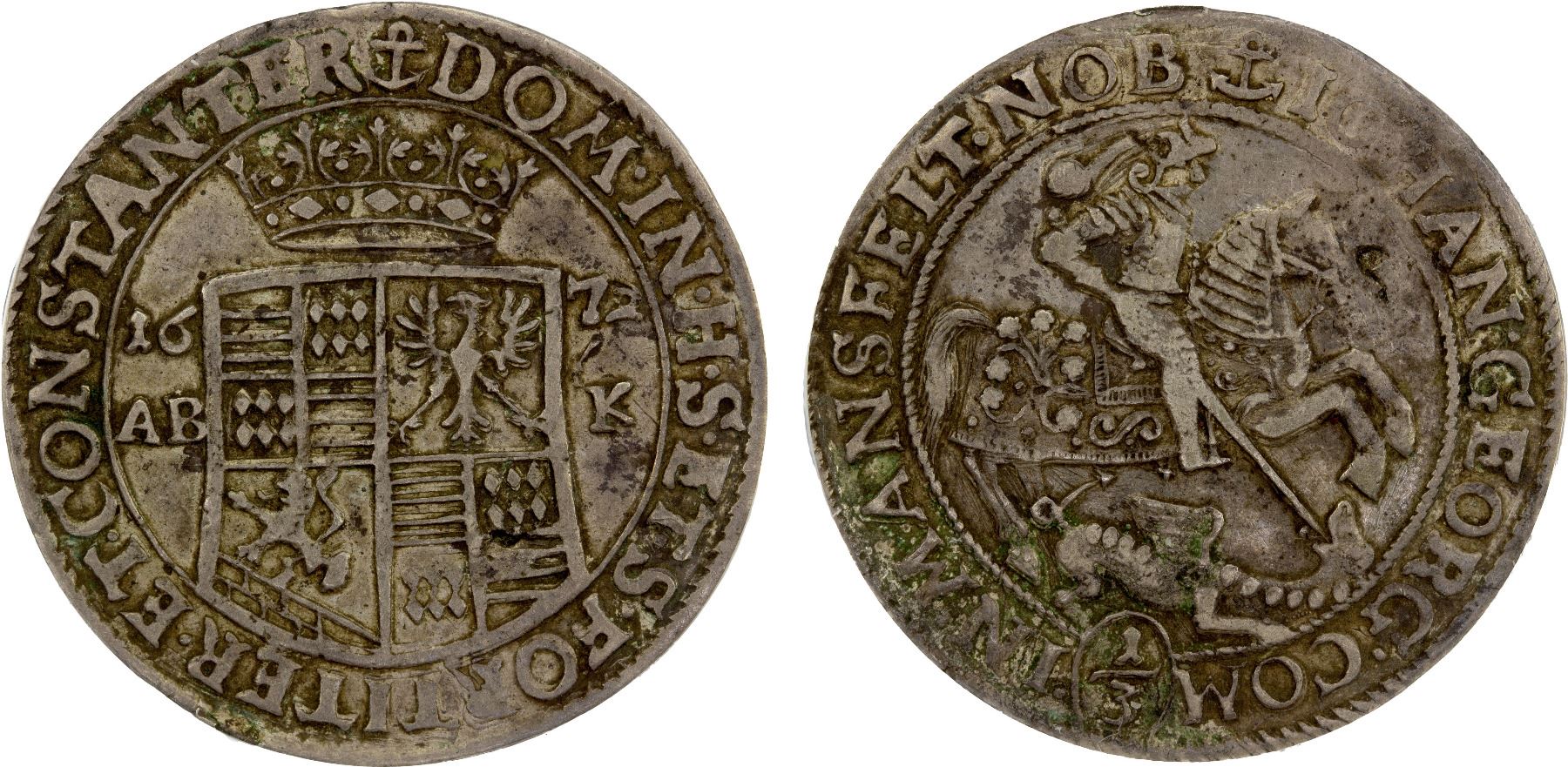 MANSFELD-BORNSTEDT: Franz Maximilian & Heinrich Franz, 1662-1715, AR 1/3 thaler, 1672, KM-125, mintmaster Anton Bernhard Kobuger, St. George slaying dragon, ANACS graded VF25.