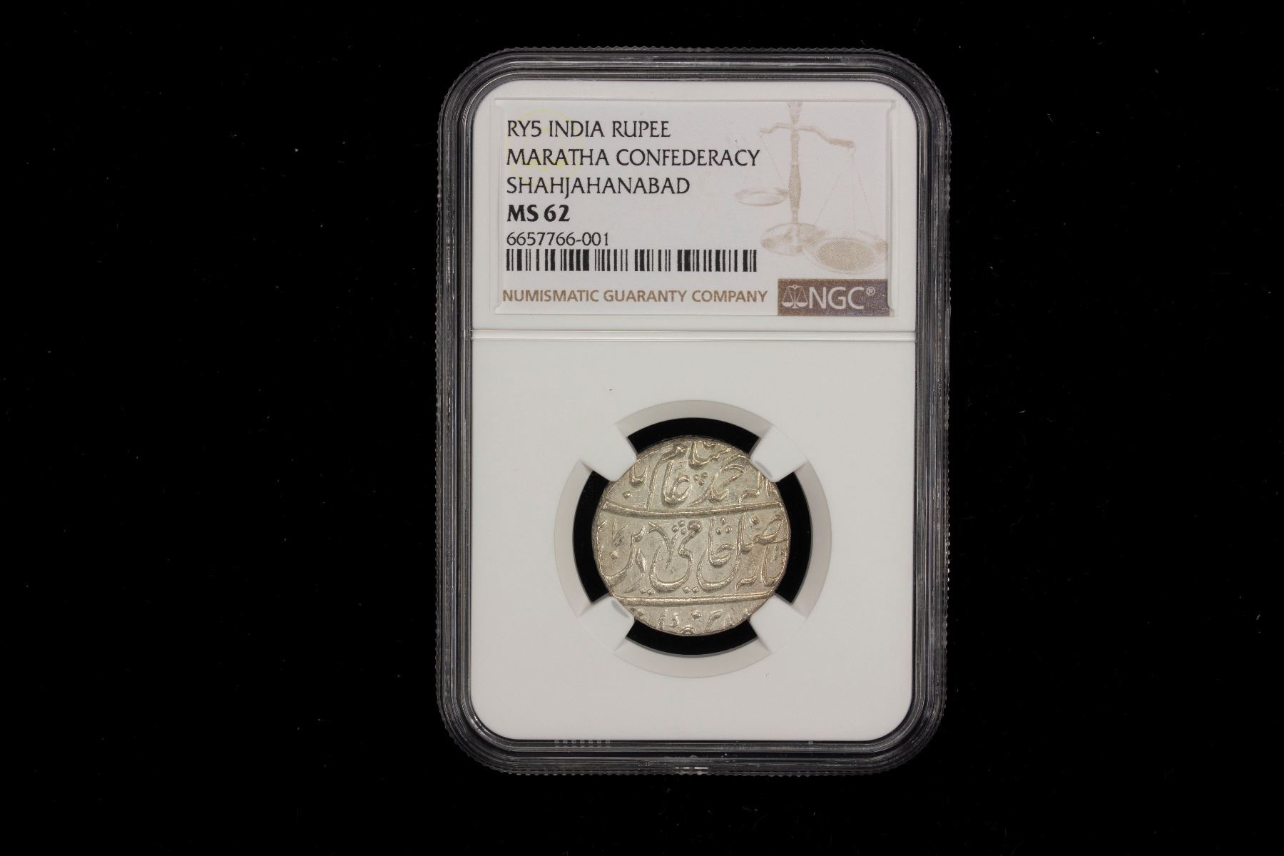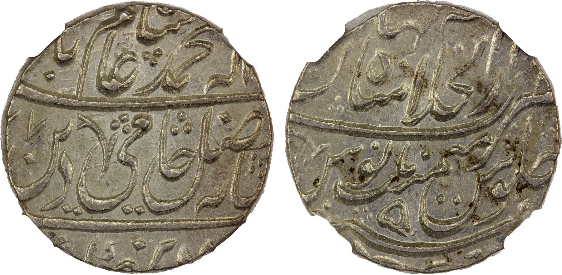 MARATHA CONFEDERACY: AR rupee, "Shahjahanabad", AH(11)77 year 5, KM-313, in the name of Shah Alam II; assigned to the Maratha by the floral symbols on obverse & reverse, NGC graded MS62, R.