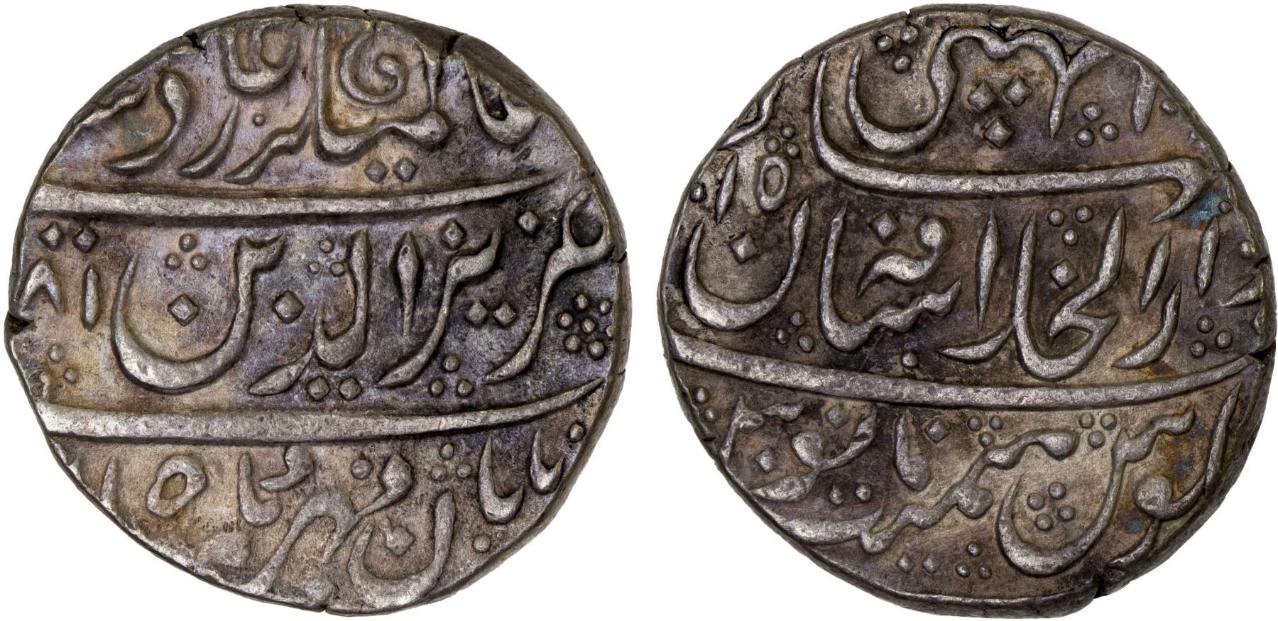 MARATHA CONFEDERACY: Athni, AR rupee, AH(11)81 year 15, KM-70, in the name of the Mughal emperor Alamgir II, XF.