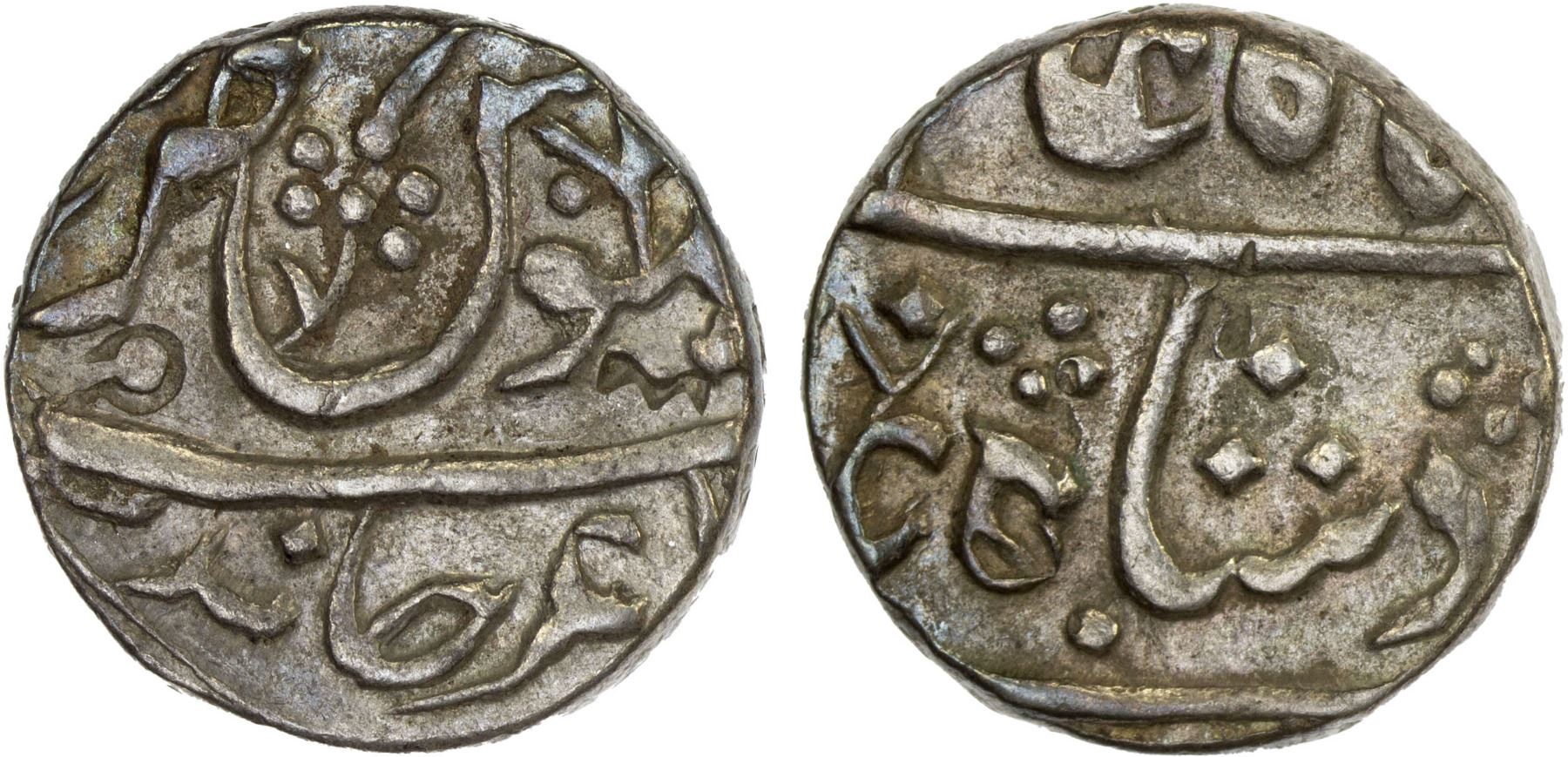 MARATHA CONFEDERACY: Chandor, AR rupee (11.12g), ND, KM-93, Wig-1c, full mint name is ja'farabad 'urf chandor, "Ja'farabad, also known as Chandor", with 'urf chandor fully visible, two banker's marks, choice XF.