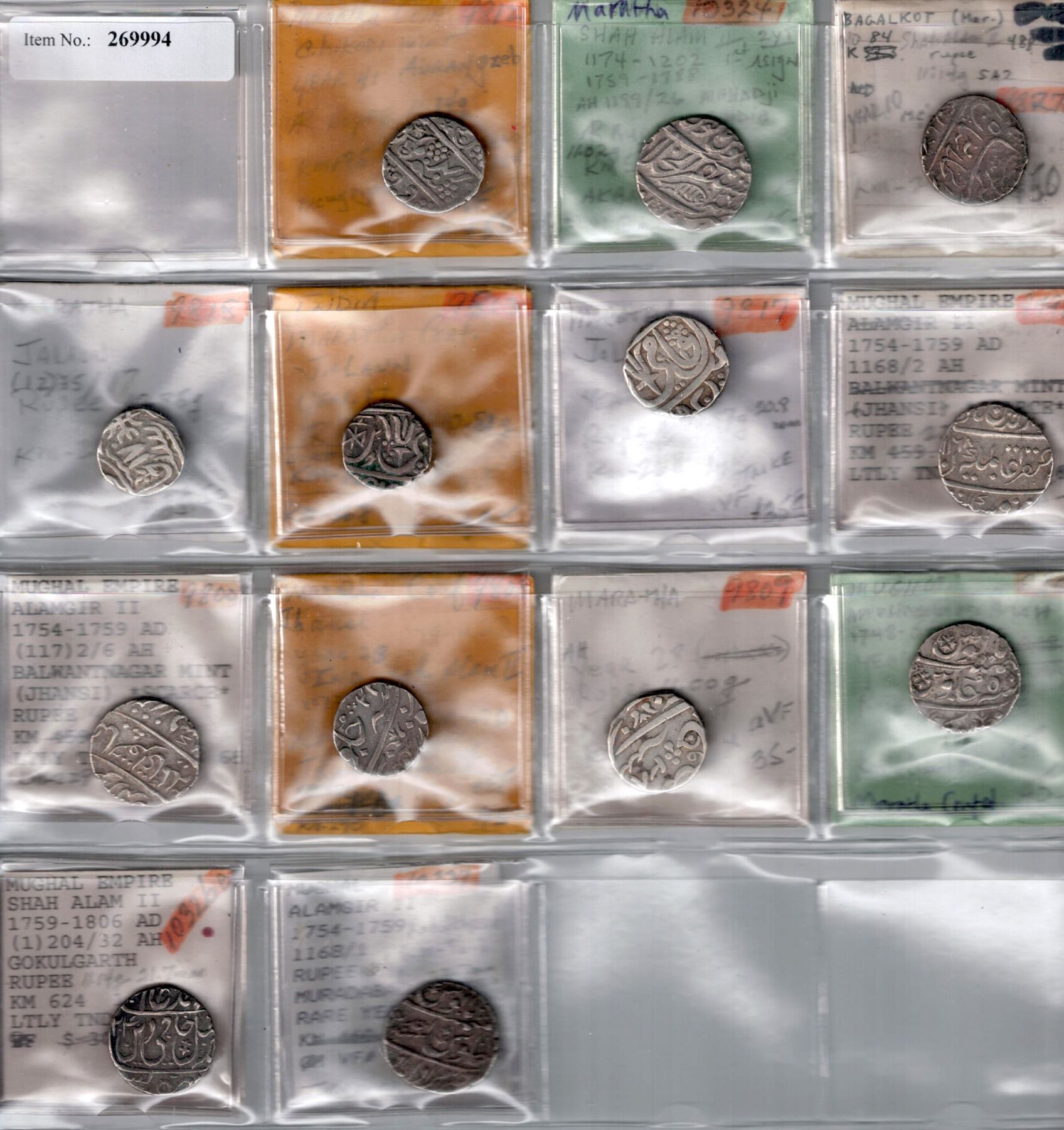 MARATHA CONFEDERACY: LOT of 13 silver rupees, including one of Rohilkand: Akbarabad: Shah Alam II 1199/26 (KM-520, 1 testmark); Bagalkot: Shah Alam II year 10 (KM-257); Balwantnagar/Jhansi: Alamgir II 1168/6 & (117)2/6 (KM-229), Shah Alam II year 28 (2, KM-270 & 271), year 5 (KM-322); Chikodi: Aurangzeb year 41 (KM-185); Gokulgarh: Shah Alam II 1204/32; Jalaun: Shah Alam II year 17 (2) & year 55 (KM-268); Muradabad: Alamgir II 1168/1; average circulated condition, retail value $550; lot of 13 pieces.