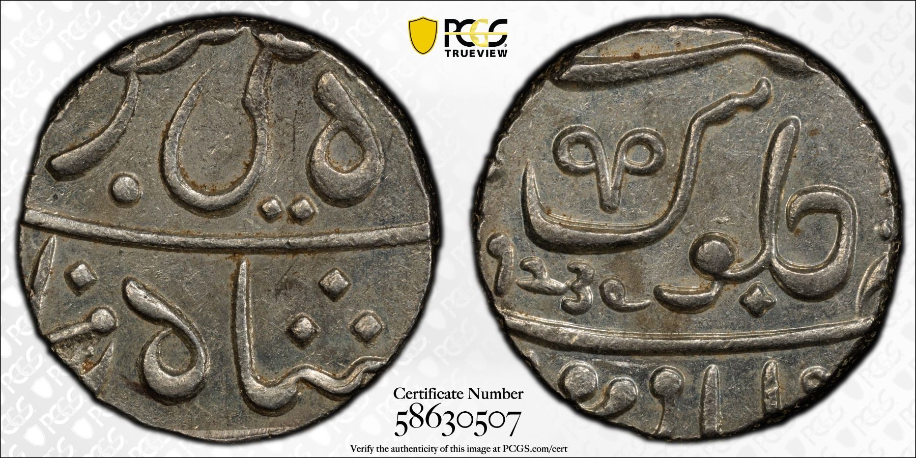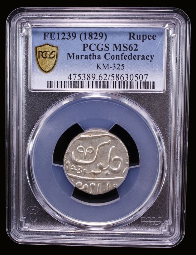 MARATHA CONFEDERACY: Poone, AR rupee (11.33g), FE1239 (1829), KM-325, East India Company issue in the name of Shah Ali Gauhar (Shah Alam II), nagphani (serpent hood) privy mark, an attractive example, PCGS graded MS62. The third Anglo - Maratha war (the Pindari war) ended in 1818 AD, with the defeat of the Marathas at the hands of the British East India Company forces led by Governor General Hastings. The Peshwas were defeated at the Battle of Khadki (Kirkee) on 5 November 1817 near Pune (Poona) and the city was seized by the British. It was placed under the administration of the Bombay Presidency. This type was struck from 1820-44, and issued by the EIC after the war ended in 1818. They were issued in the name of the Mughal Emperor so they would be accepted by the local people. The Fasli Era has a 12 month calendar from July to June. Adding 590 to Fasli year = Gregorian calendar (AD). Fasli which means harvest is derived from the Arabic term for division, which in India was applied to the groupings of the seasons. The Fasli Calendar is a chronological system introduced by the Mughal Emperor Akbar. The 'nagphani' (serpent hood) mint mark resembles the spectacle markings on the hood of a cobra.