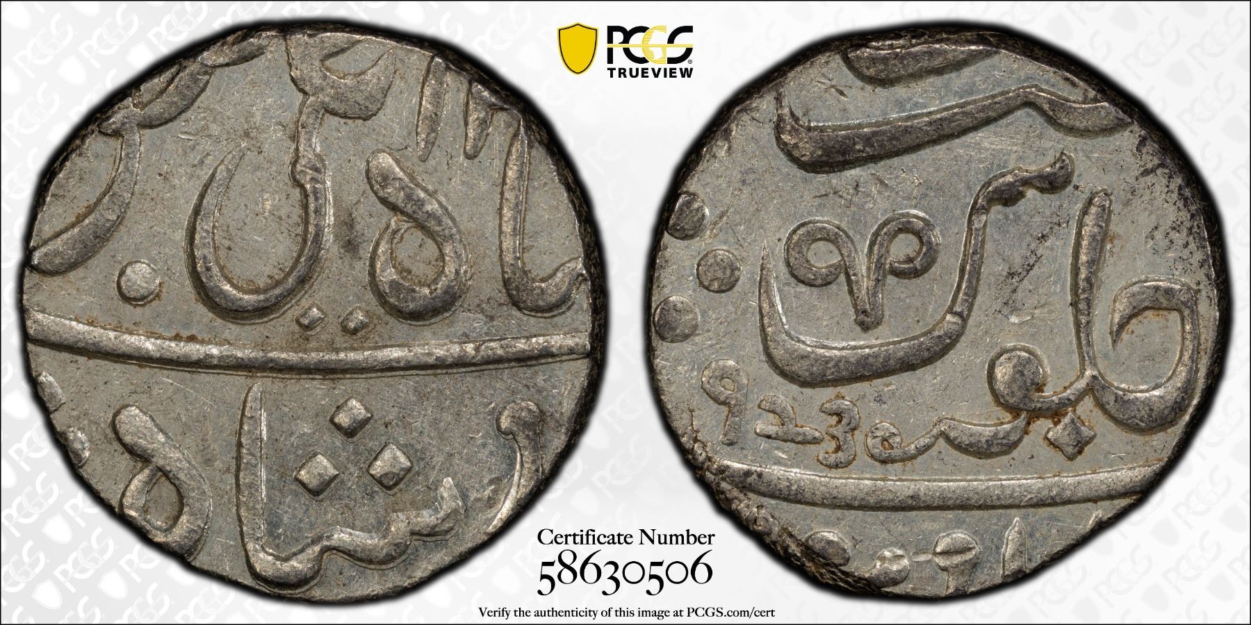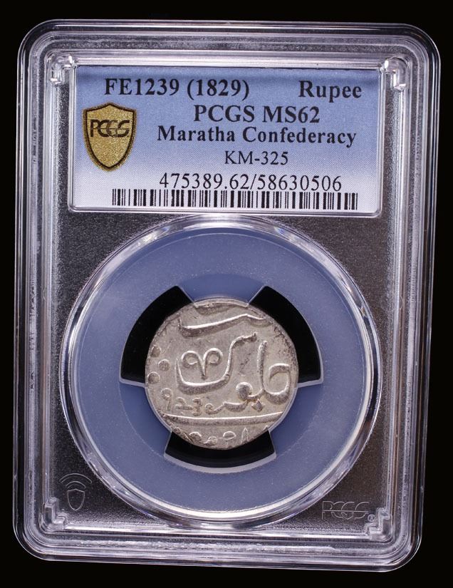 MARATHA CONFEDERACY: Poone, AR rupee (11.42g), FE1239 (1829), KM-325, East India Company issue in the name of Shah Ali Gauhar (Shah Alam II), nagphani (serpent hood) privy mark, an attractive example, PCGS graded MS62. The third Anglo - Maratha war (the Pindari war) ended in 1818 AD, with the defeat of the Marathas at the hands of the British East India Company forces led by Governor General Hastings. The Peshwas were defeated at the Battle of Khadki (Kirkee) on 5 November 1817 near Pune (Poona) and the city was seized by the British. It was placed under the administration of the Bombay Presidency. This type was struck from 1820-44, and issued by the EIC after the war ended in 1818. They were issued in the name of the Mughal Emperor so they would be accepted by the local people. The Fasli Era has a 12 month calendar from July to June. Adding 590 to Fasli year = Gregorian calendar (AD). Fasli which means harvest is derived from the Arabic term for division, which in India was applied to the groupings of the seasons. The Fasli Calendar is a chronological system introduced by the Mughal Emperor Akbar. The 'nagphani' (serpent hood) mint mark resembles the spectacle markings on the hood of a cobra.