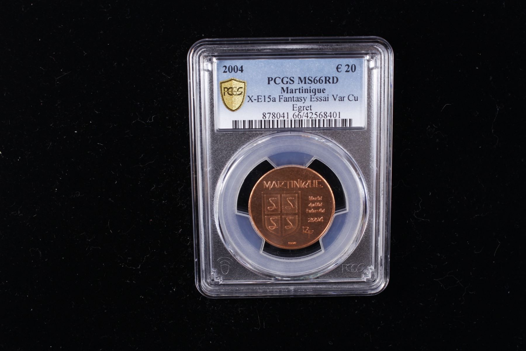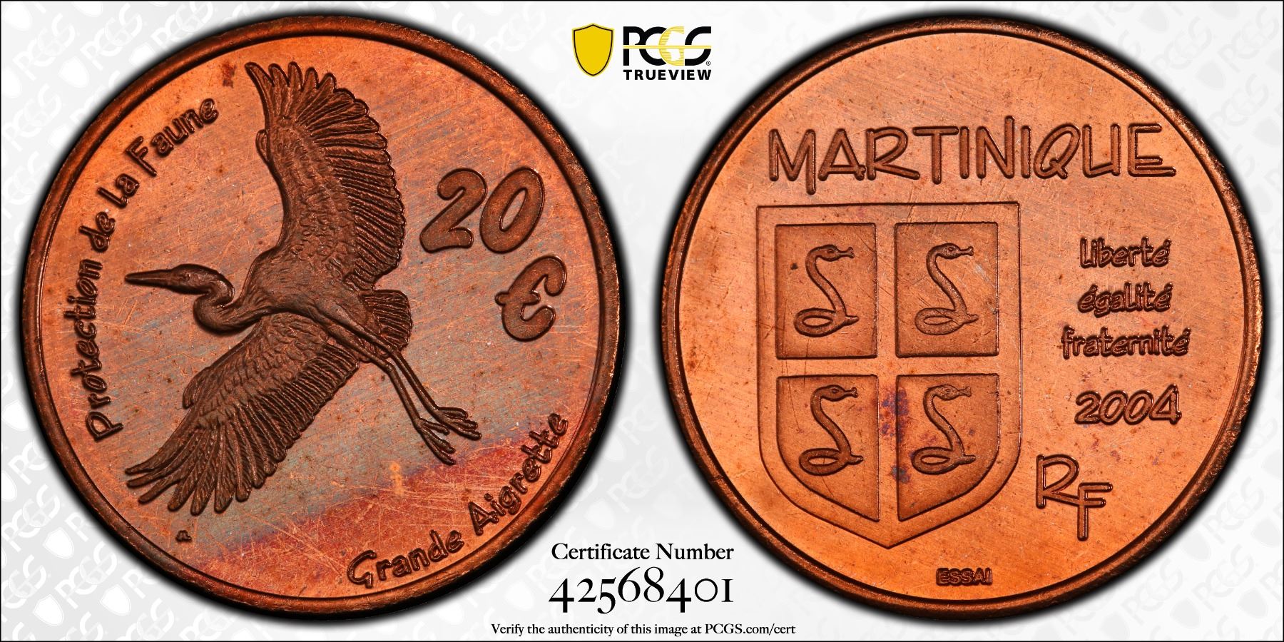 MARTINIQUE: Fantasy Issues, AE 20 euro, 2004, KM-XE15a, Wildlife Conservation Series - Great Egret, fantasy pattern essai in pure copper, mintage of only 30 pieces, very rare, PCGS graded MS66 RD. Private pattern struck at the Patrick Mint. The mint began operating in 1972 and was known for striking mainly tokens until the mint was destroyed in the 2017 Tubbs Fire in the "Northern California Firestorm" along with 5,642 other structures in Santa Rosa, California.