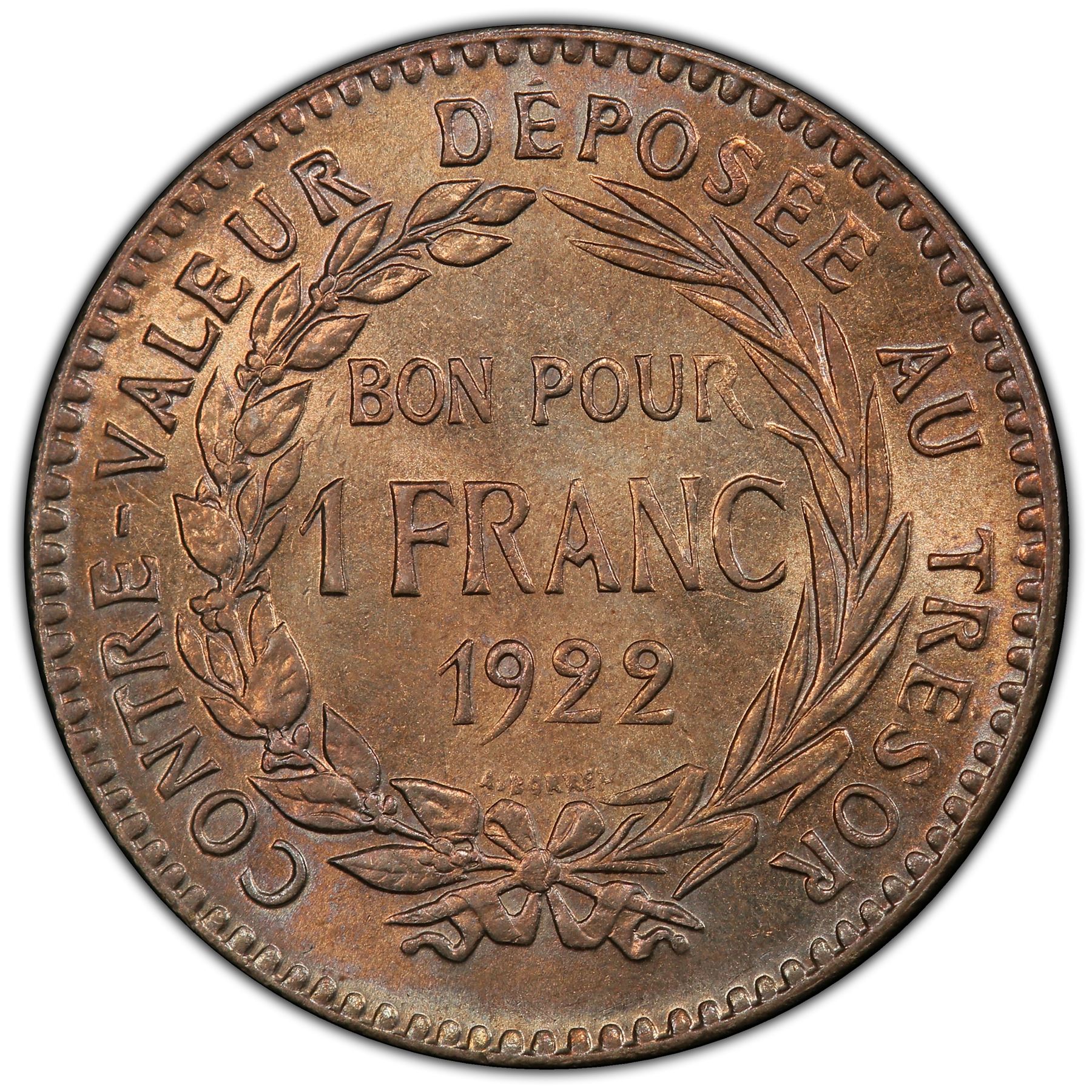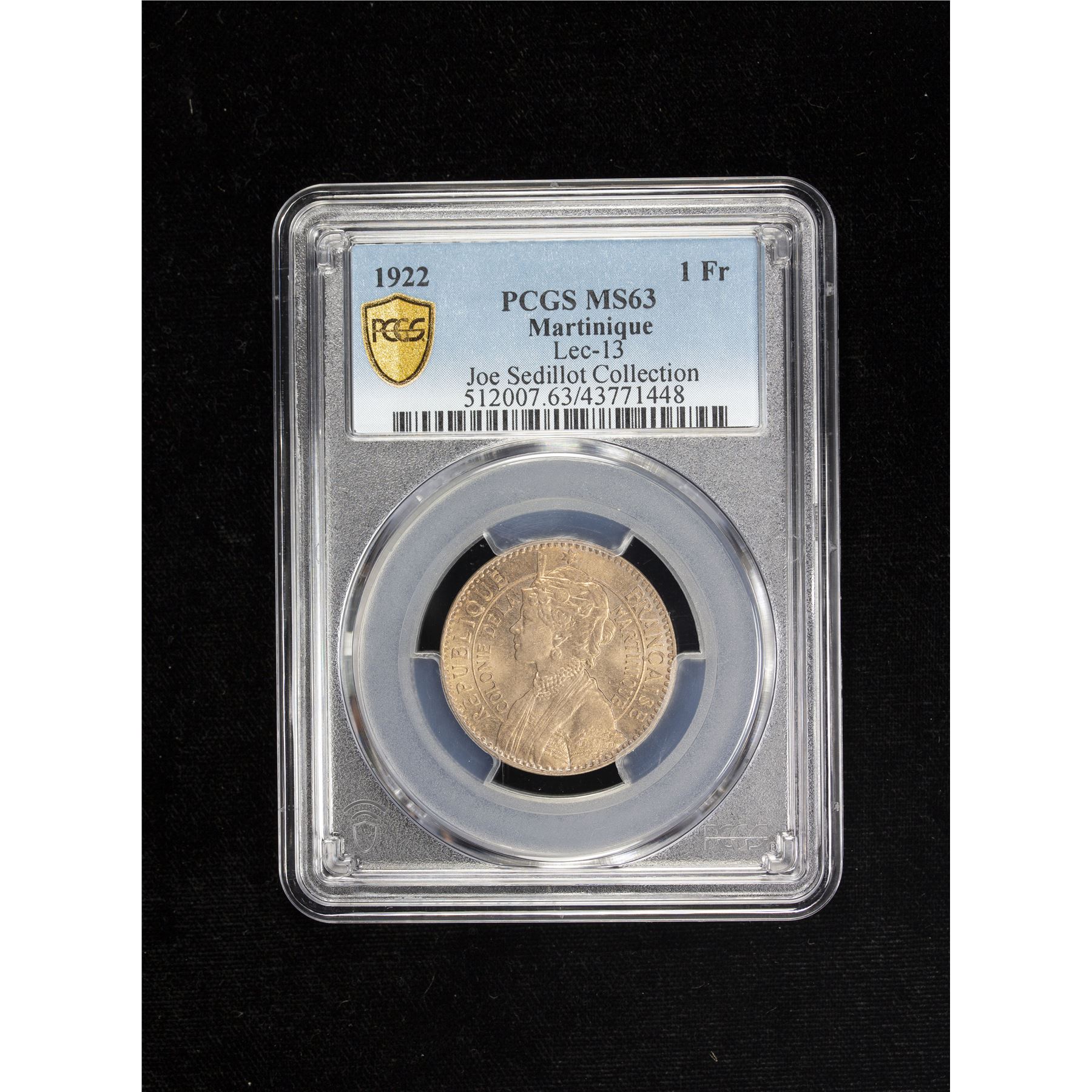 MARTINIQUE: French Colony, 1 franc, 1922, KM-41, Lec-13, a lovely mint state example! PCGS graded MS63, ex Joe Sedillot Collection.