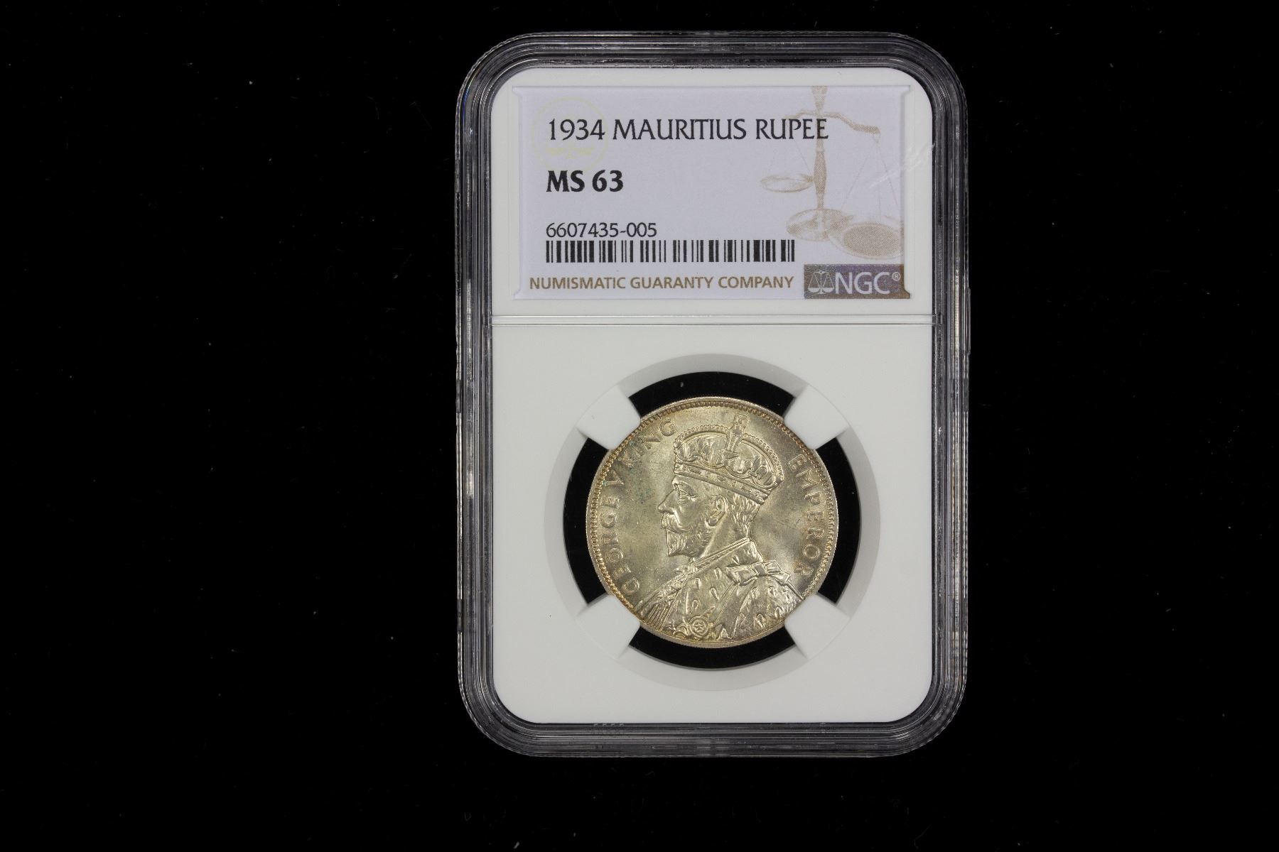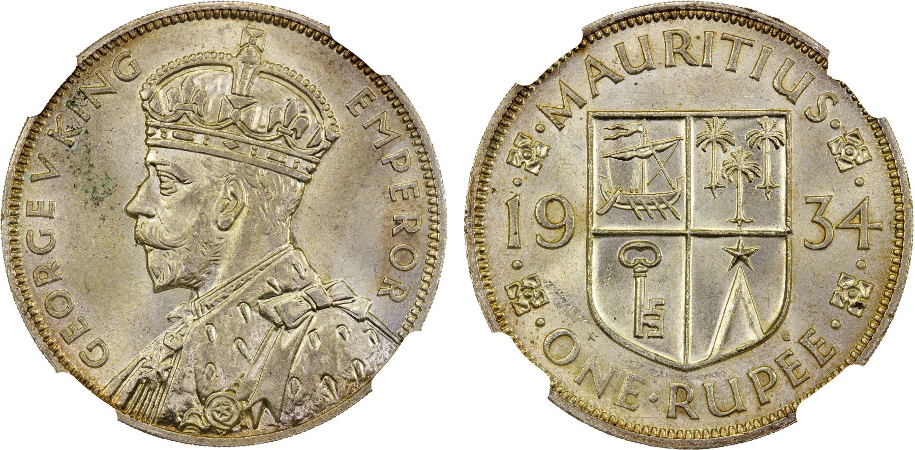 MAURITIUS: George V, 1910-1936, AR rupee, 1934, KM-17, one-year type, beautiful satiny luster, NGC graded MS63.