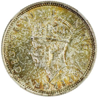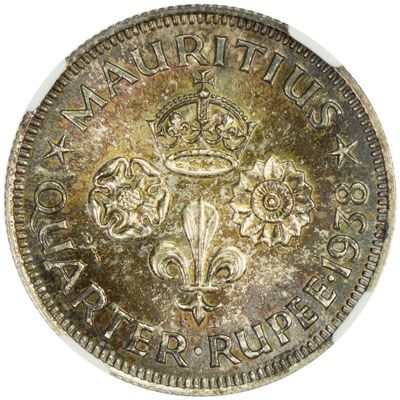 MAURITIUS: George VI, 1937-1952, AR ¼ rupee, 1938, KM-18, golden iridescent toning, finest known (population 1), NGC graded MS66.