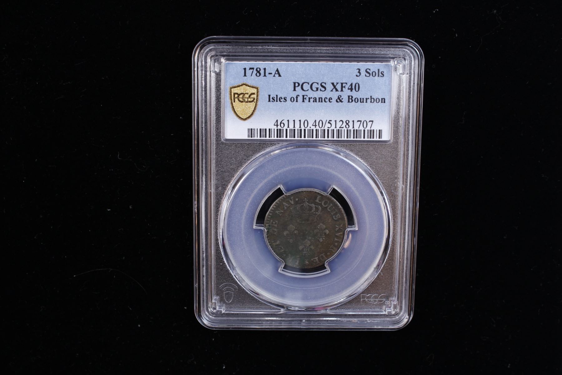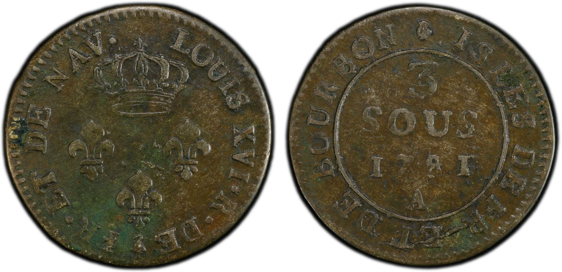 MAURITIUS: Isle de France et de Bourbon, BI 3 sous, 1781-A, KM-2, PCGS graded EF40. Reunion was previously known as the Isle Bourbon, after the French royal House of Bourbon. In 1793, during the Revolution, its name was changed to "Reunion Island" in homage to the meeting of the Federates of Marseilles and the National Guards of Paris, during the march on the Tuileries Palace on August 10, 1792, and to erase the name of the Bourbon dynasty.