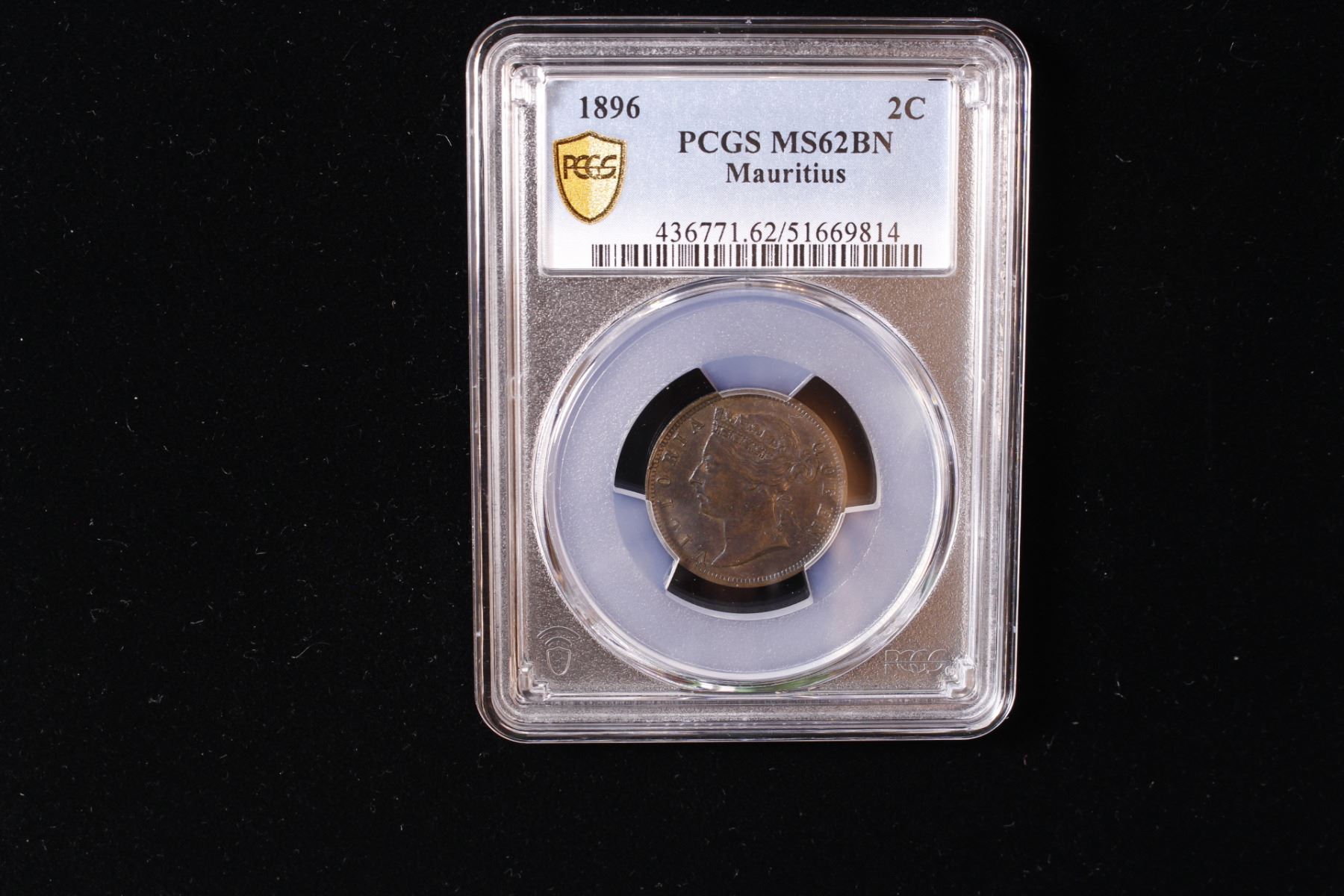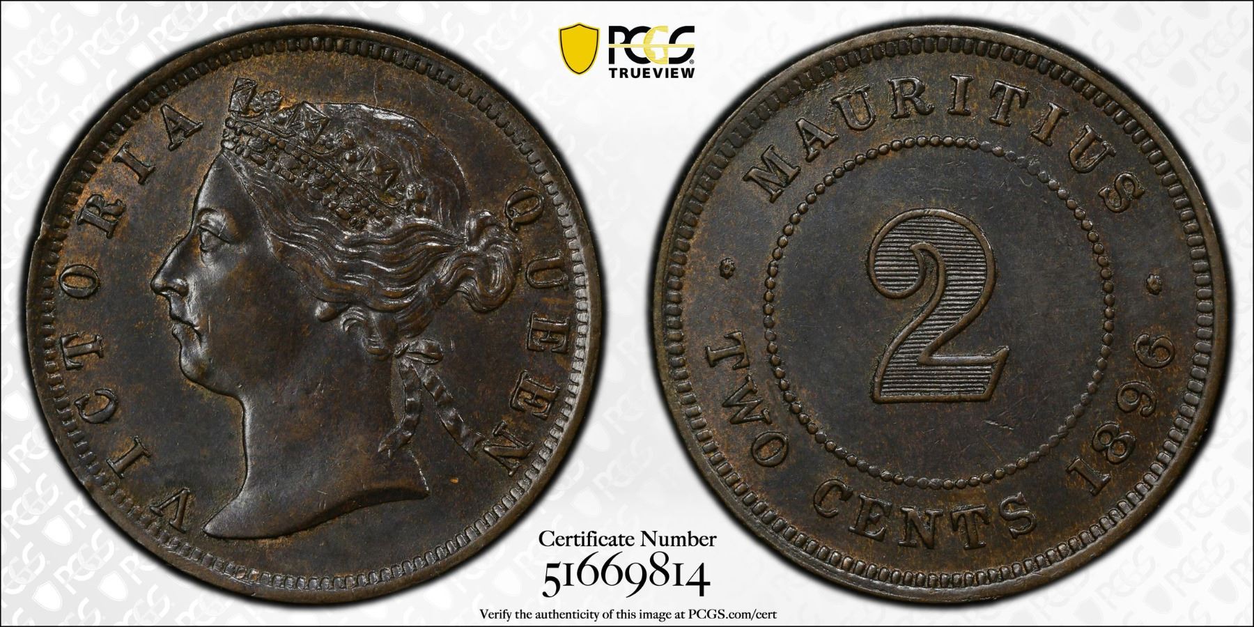 MAURITIUS: Victoria, 1837-1901, AE 2 cents, 1896, KM-8, a pleasing mint state example, PCGS graded MS62 BN, ex Almer H. Orr III Collection.